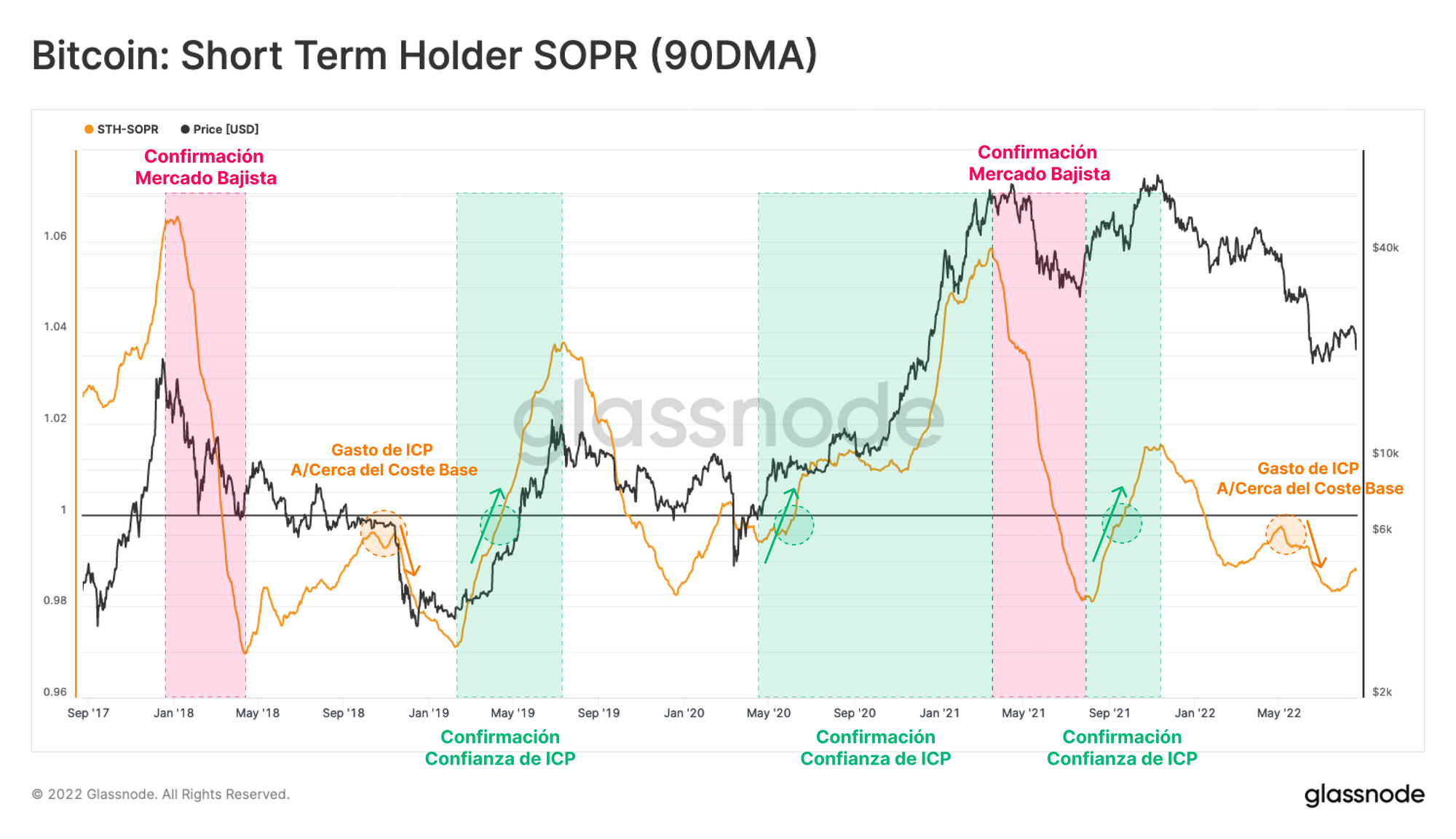 Es cierto que la actual estructura de mercado imita los patrones de formación de mínimos de los anteriores mercados bajistas, tal y como comentamos en el informe de la Semana en el Blockchain 29. En términos generales, tras suceder una larga fase de acumulación, cualquier movimiento positivo en el precio tiende a levantar los ánimos de los inversores a corto plazo, y particularmente la de aquellos cuyo coste base está muy cerca del valor de mercado.
