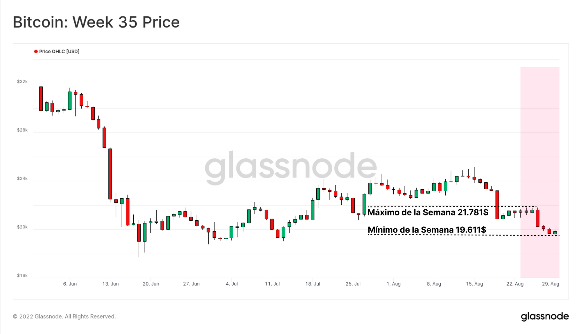 Los gobernantes de la Reserva Federal estadounidense continúan reafirmando su intención de atajar con mano de hierro el problema de la inflación, y Bitcoin, como el índice de liquidez global que está destinado a ser, ha reaccionado acorde. El precio ha seguido cayendo esta semana, arrancando desde un máximo de 21.781$ hasta alcanzar un mínimo multi-semanal de 19.611$.