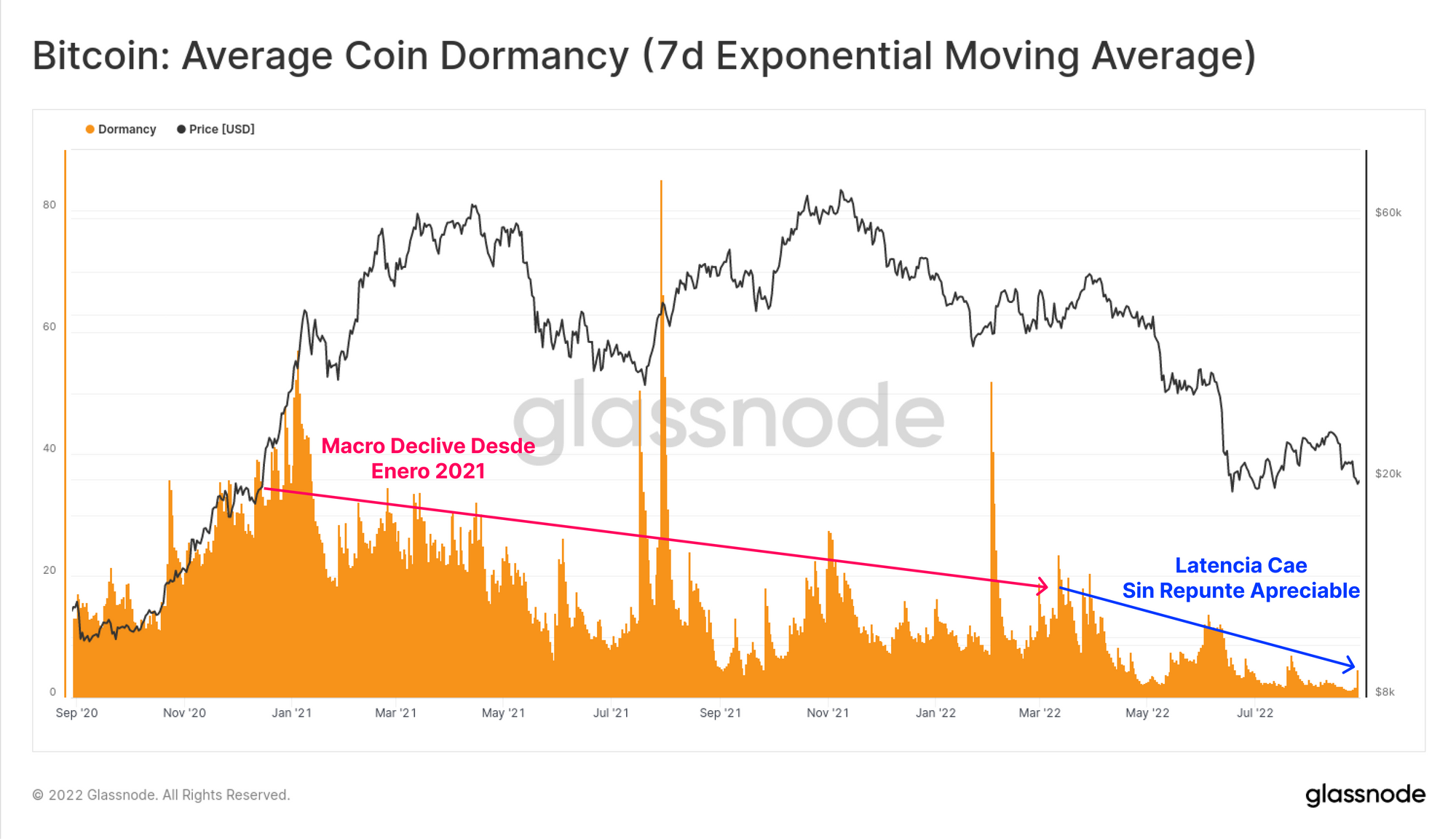 Podemos entrar en más detalle echando un vistazo a la Latencia, que es la media de edad de cada unidad monetaria que se desplaza por el network. Esta métrica sí tiene en cuenta el volumen monetario que se gasta. Aquí vemos que la media de edad por moneda se encuentra en mínimos multi-anuales, lo que significa que el repunte que identificamos anteriormente en la Longevidad Media Gastada por Transacción, se componía en realidad de un volumen muy bajo de BTC, lo que sin embargo refuerza el argumento de que persiste una demanda muy débil en la red de Bitcoin.