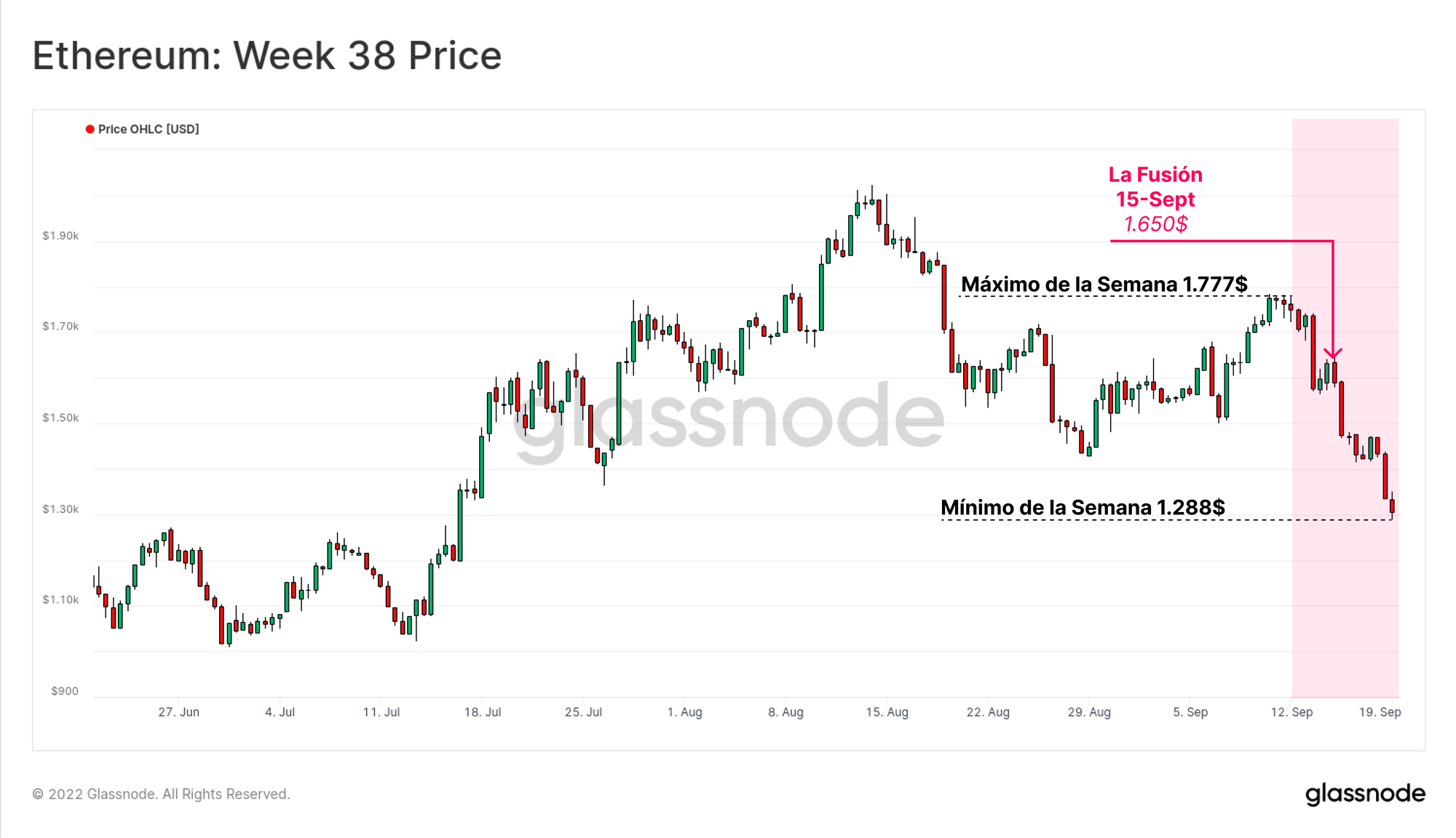 En nuestro Informe de la Semana 32, describimos cómo la manera en que se posicionó el mercado de Futuros y Opciones tenía todo el aspecto de un evento al más puro estilo ‘vende la noticia’. Efectivamente, el precio de ETH ha caído, de un máximo semanal de 1.777$, a los 1.650$ en la hora de la Fusión, para después colapsar hasta un mínimo de 1.288$ el domingo.