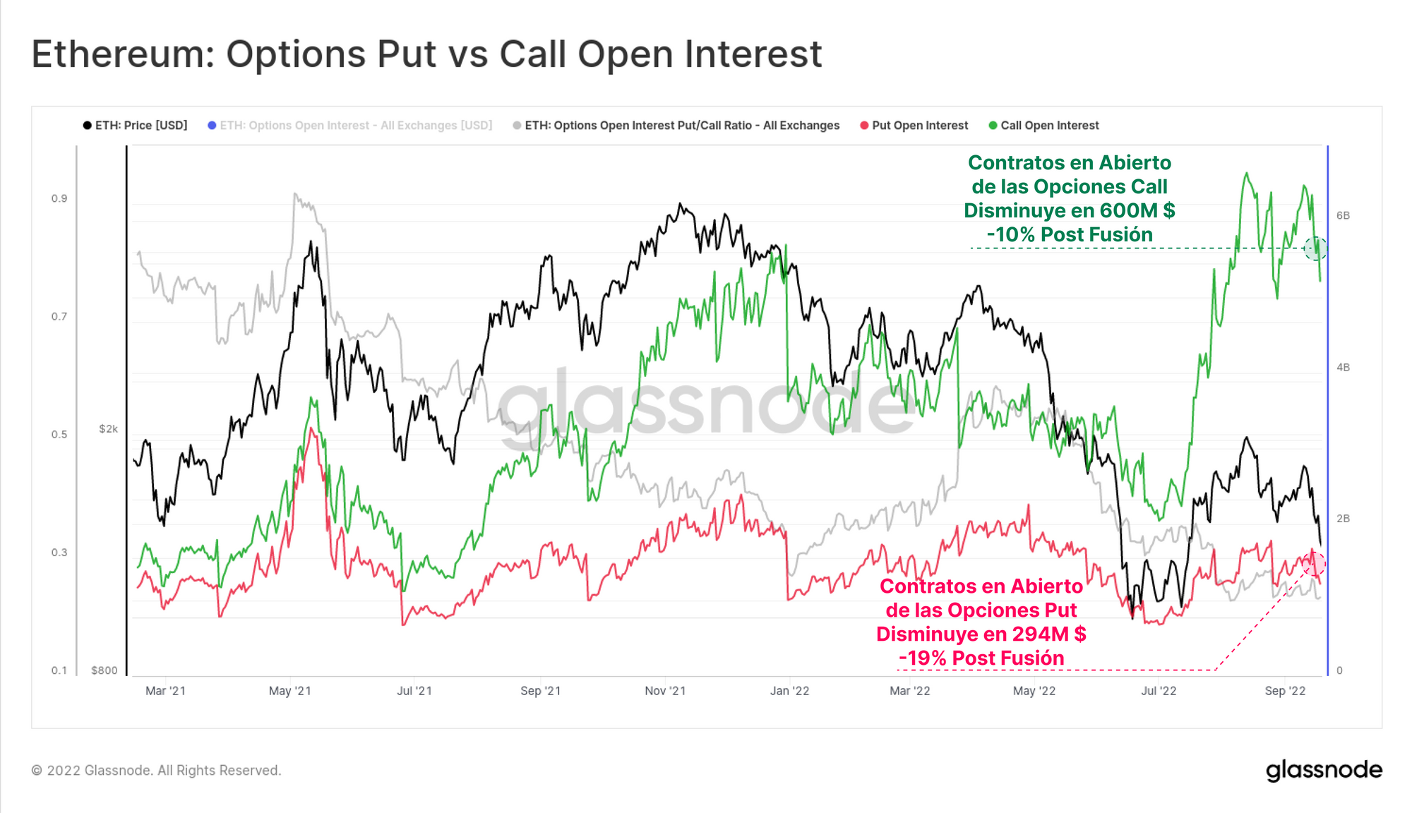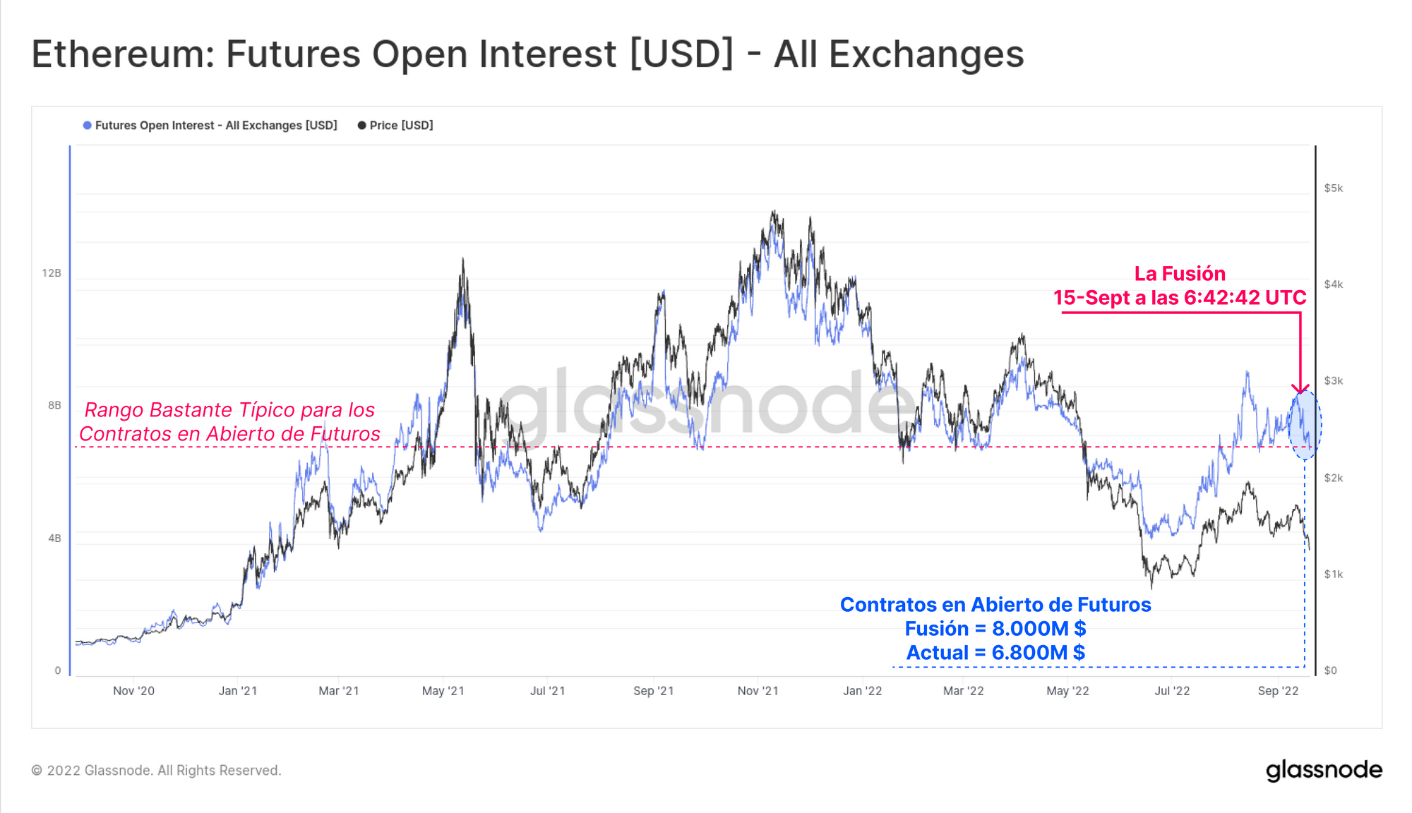 Los Contratos en Abierto de los Futuros cayeron un 15% después de la Fusión de 8.000M $ a 6.800M $, son extremos bastante típicos dentro del entorno de mercado del 2021-22. Aunque, para no salirnos de contexto, debemos tener en cuenta cómo afecta el cambio de precio del propio ETH, porque influye directamente en el valor en dólares que reflejan los tamaños de posiciones que utilizan ETH como margen en los futuros.