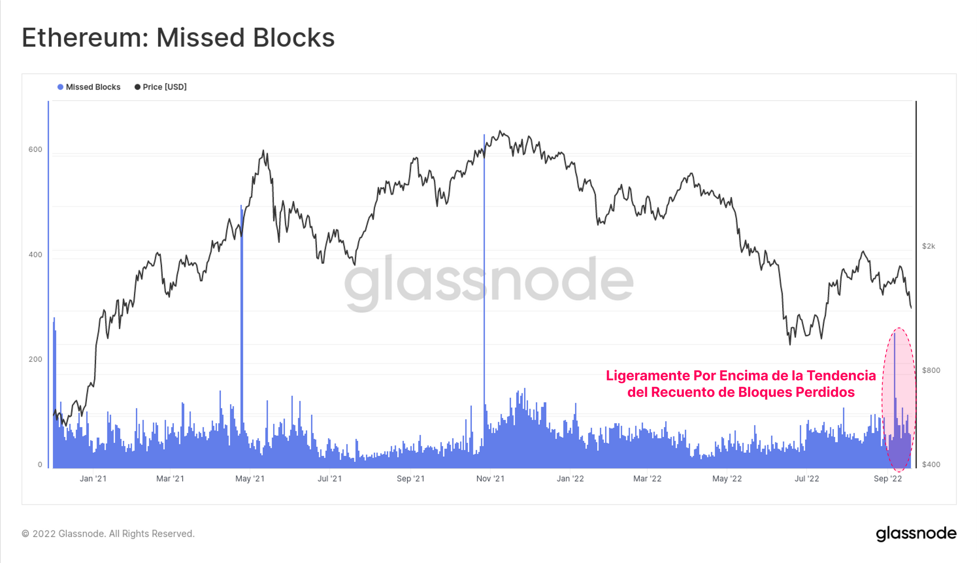Durante las semanas previas a la Fusión, se observa un pequeño descenso en el Ratio de Participación por debajo del típico nivel del 99%, que llegó a estar cerca del 97,5%. Tras la Fusión, regresamos al rango del +99%, lo que sugiere que no fue más que una breve interrupción dentro de un sub-grupo de validadores.
