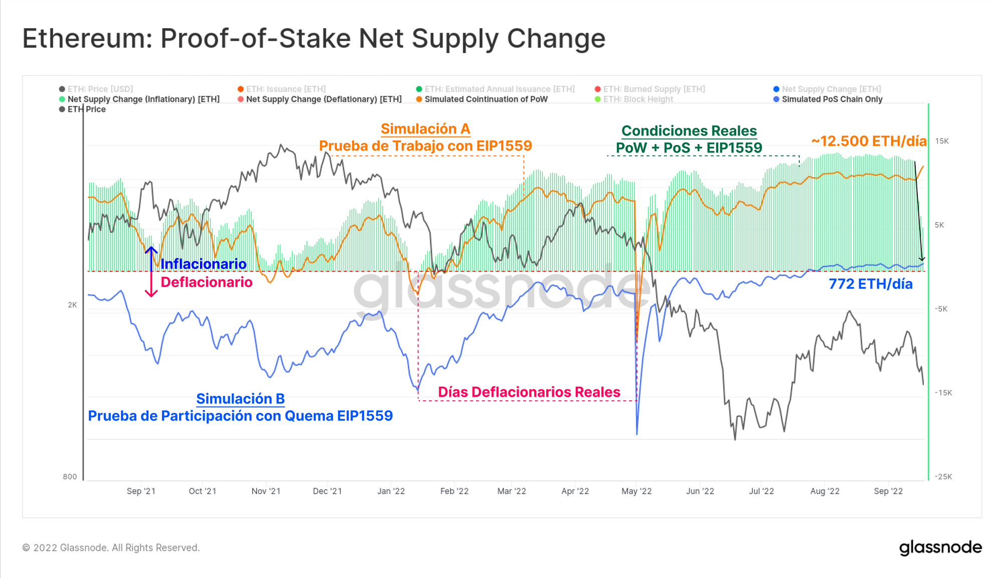 - La Simulación con la PoS como única cadena 🔵, asume que la Fusión tuvo lugar durante el lanzamiento del EIP1559 en agosto del 2021, y por tanto ignora todas las recompensas por bloque emitidas mediante el PoW desde esa fecha. Como es lógico, esta gráfica se alinea ahora con la franja post-Fusión.