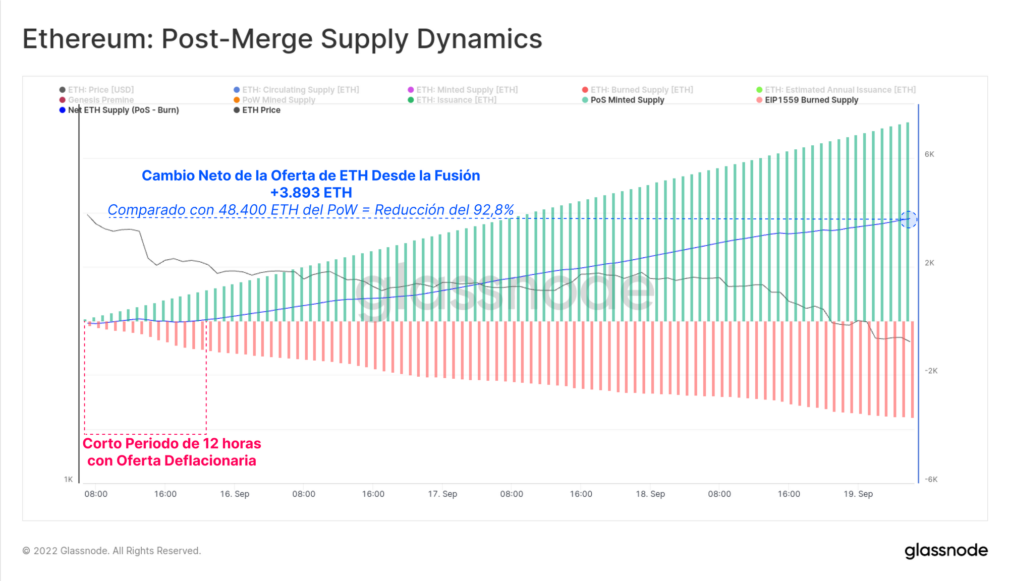 Inmediatamente después del evento de la Fusión, una avalancha en la demanda de espacio por bloque consiguió que las comisiones del gas se elevasen, lo que inicialmente provocó una deflación neta en la oferta de ETH durante un periodo de 12 horas. No obstante, al disiparse la congestión, y regresar las comisiones a valores más bajos, la oferta general de ETH ha seguido aumentando, aunque es cierto que ahora lo hace a una velocidad tremendamente inferior comparado con el ritmo que imprimía el sistema PoW.