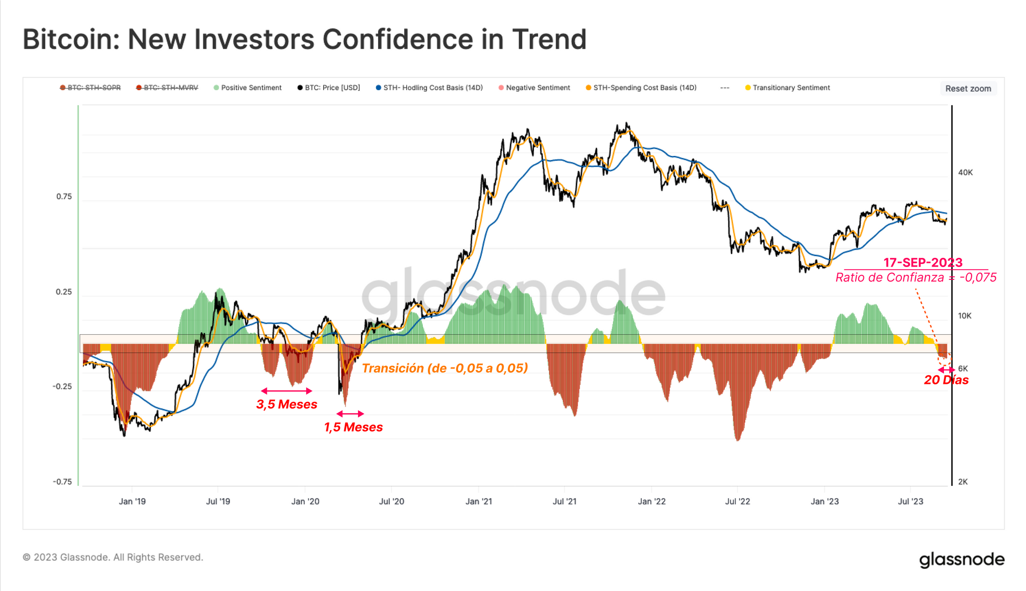 El mercado de Bitcoin está atravesando un momento bastante significativo con cambios en el sentimiento inversor, donde casi toda la oferta en manos de los Inversores a Corto Plazo está en pérdidas. En consecuencia el sentimiento de merado ha experimentado un cambio negativo, como sabemos por el hecho de que el coste base de los inversores que gastan está por debajo del resto de inversores a corto plazo. Esto quiere decir que predomina un cierto grado de pánico dentro de este grupo inversor por primera vez desde que FTX colapsó.