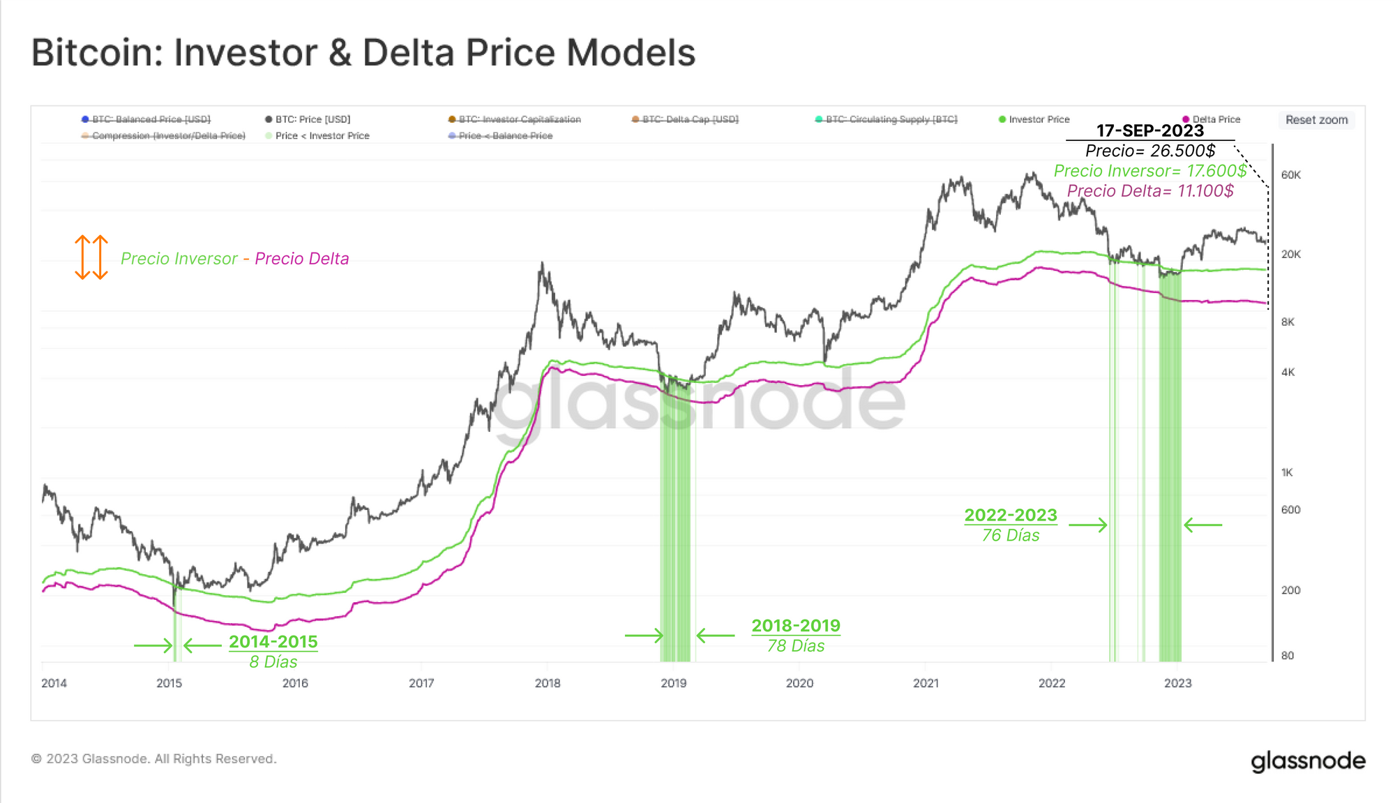La acción de precio muestra que en el ciclo del 2018-2019 y en el 2022-23 pasamos una cantidad de tiempo muy similar atrapados entre estos dos modelos de valorización cuando esculpíamos los mínimos de mercado absolutos. Hay que recalcar que el mercado hizo una visita al Precio Inversor en medio del caos desatado por el desplome de marzo del 2020.