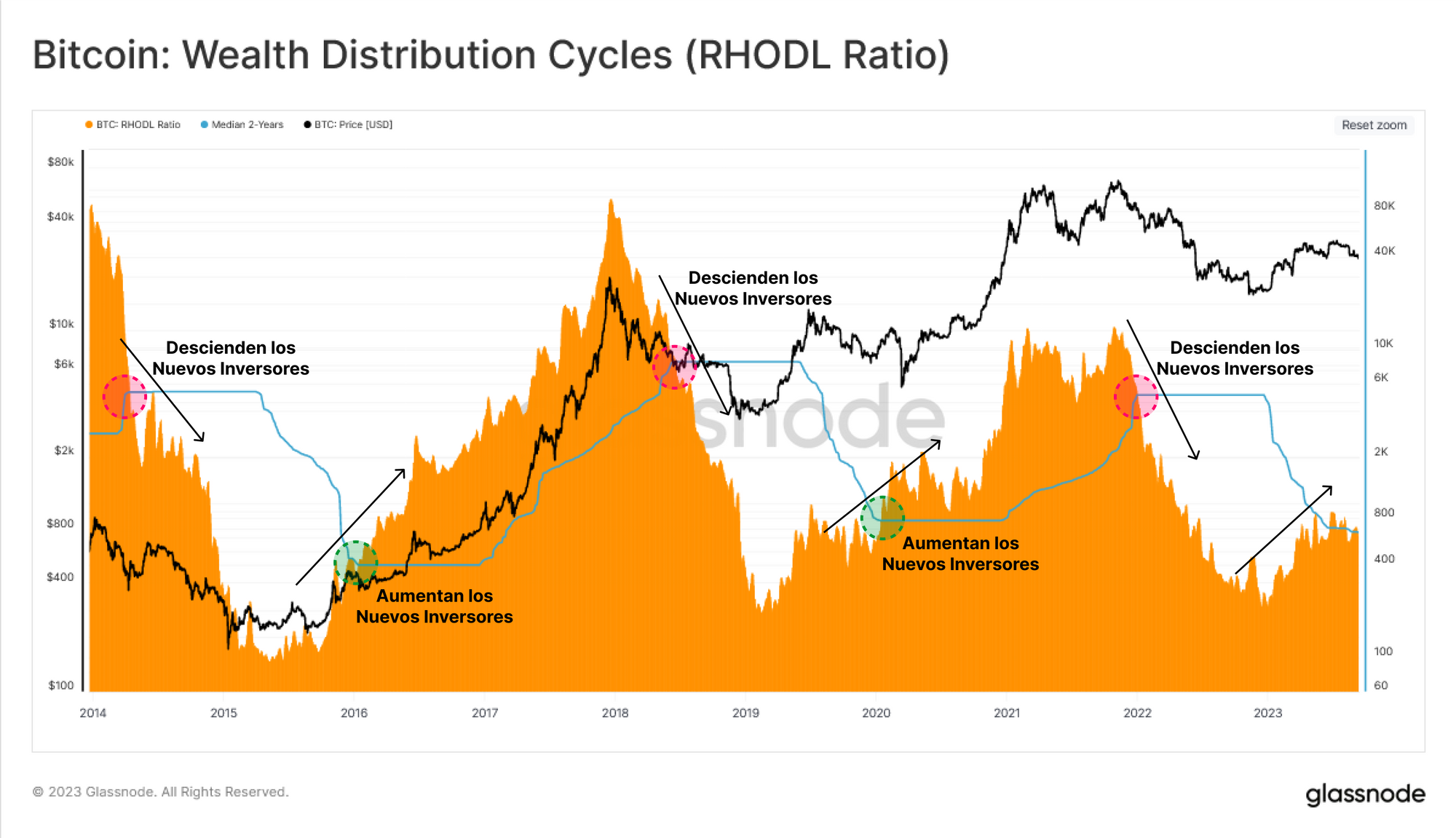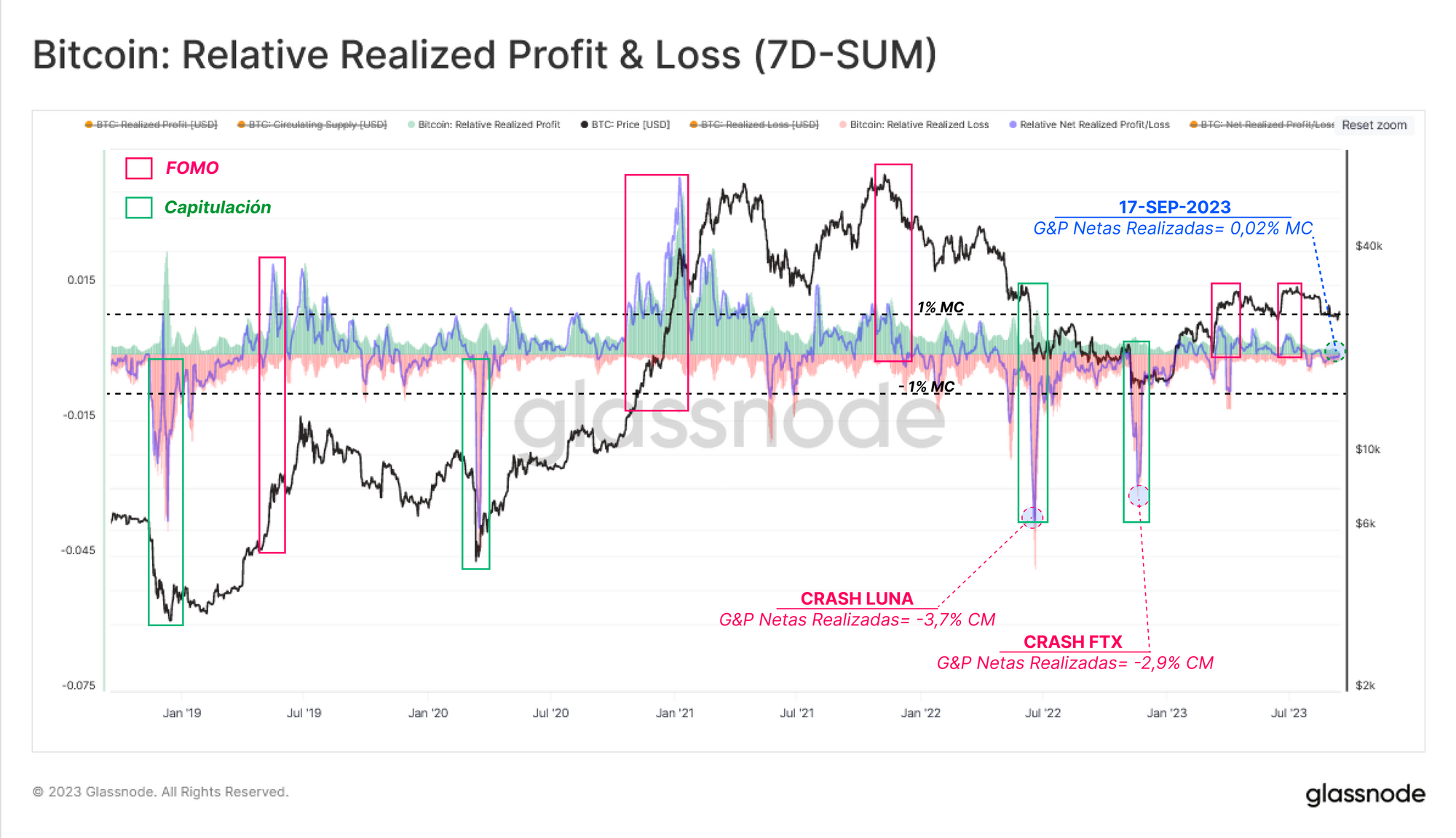 Gracias a esta métrica se hace evidente que el impulso de recuperación del 2023 ha venido acompañado de unas grandes acumulaciones que se han producido precisamente en los máximos locales impresos sobre los 30.000$. Es una clara muestra del FOMO 🔴 puntual que han sufrido muchos inversores. Esto contrasta de lleno con los eventos de capitulación que registramos durante la segunda mitad del 2022, donde muchos nuevos inversores no dudaron en aprovechar la oportunidad para acumular en los mínimos locales 🟢.