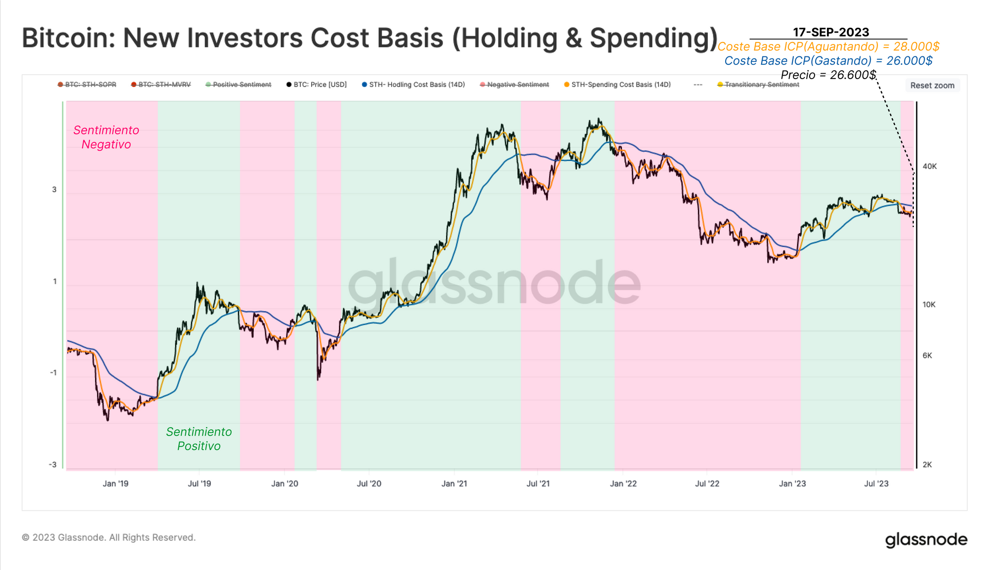 Desde esta nueva perspectiva, vemos que el coste base de los ICP que deciden gastar sus monedas en posesión cayó por debajo de los ICP que se mantienen firmes a pesar del desplome que a mediados de agosto nos condujo de los 29.000$ a los 26.000$. Este hecho sugiere que existe un cierto grado de pánico y que en cierto modo a corto plazo se ha implantado un sentimiento más bien negativo en el mercado actual.