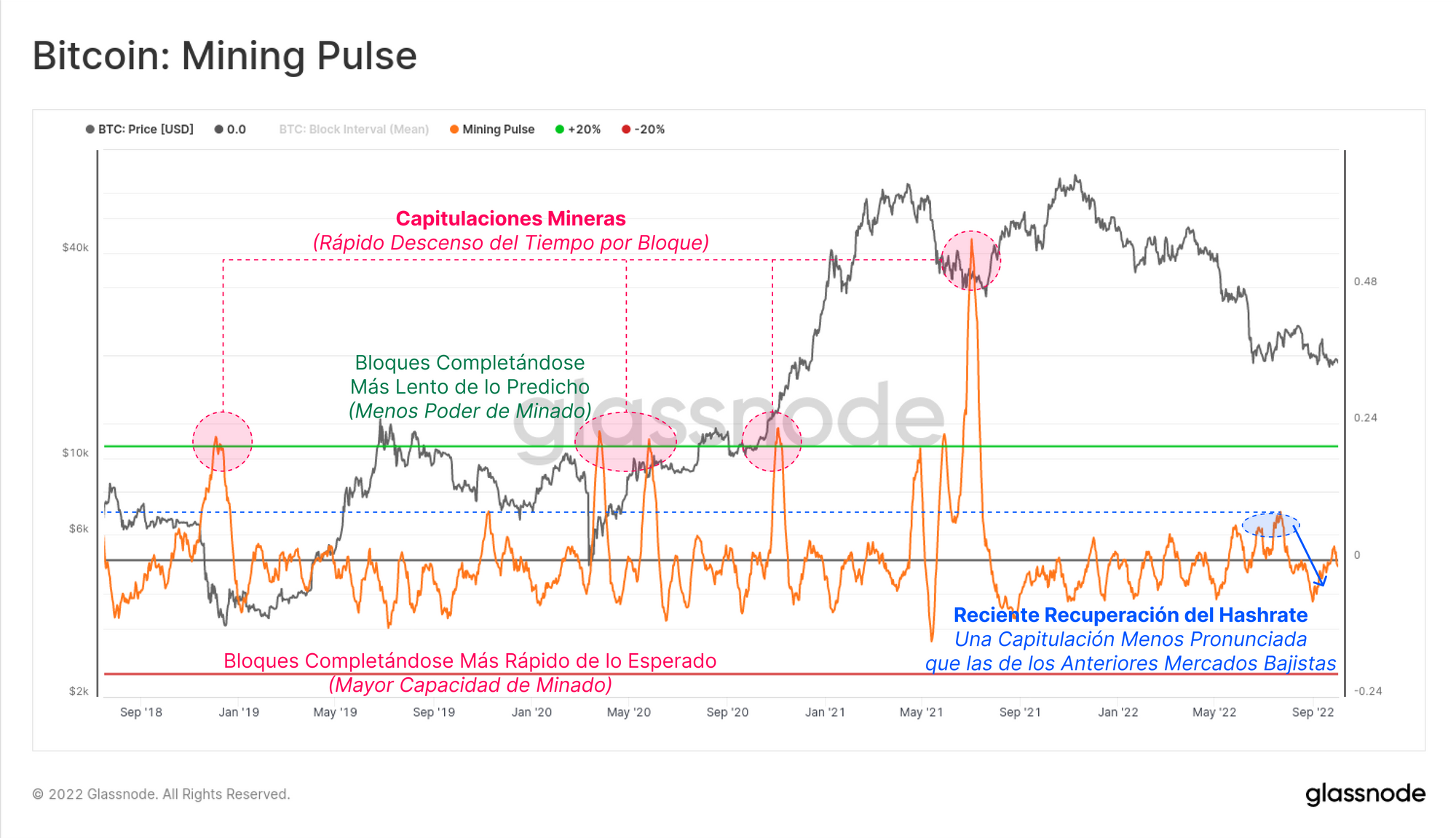 - Unos valores más altos indican que los bloques se completan en más de esos 600 segundos, indicativo de que hay una cierta cantidad de hashrate que está literalmente desenchufándose del network, algo que frecuentemente se produce en respuesta a ciertos golpes que se pueda llevar la industria, como pueden ser los eventos de capitulación.