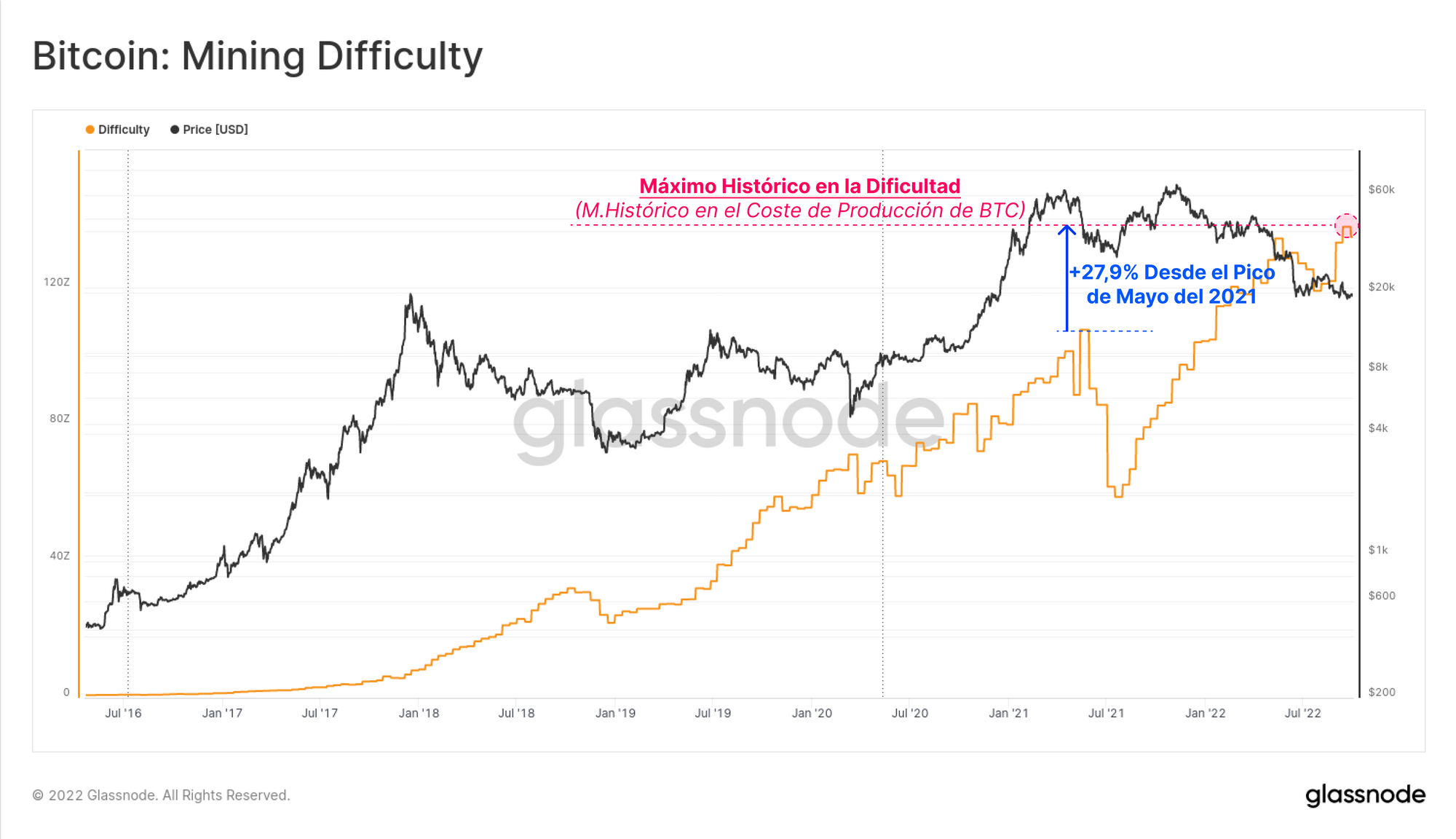 Al tiempo que se conecta más hashrate al sistema, la Dificultad de Minado ha comenzado a implementar una serie de subidas en los ajustes, llegando a estar a estas alturas un 27,9% por encima del pico que se imprimió como consecuencia de la Gran Migración Minera de mayo del pasado 2021.