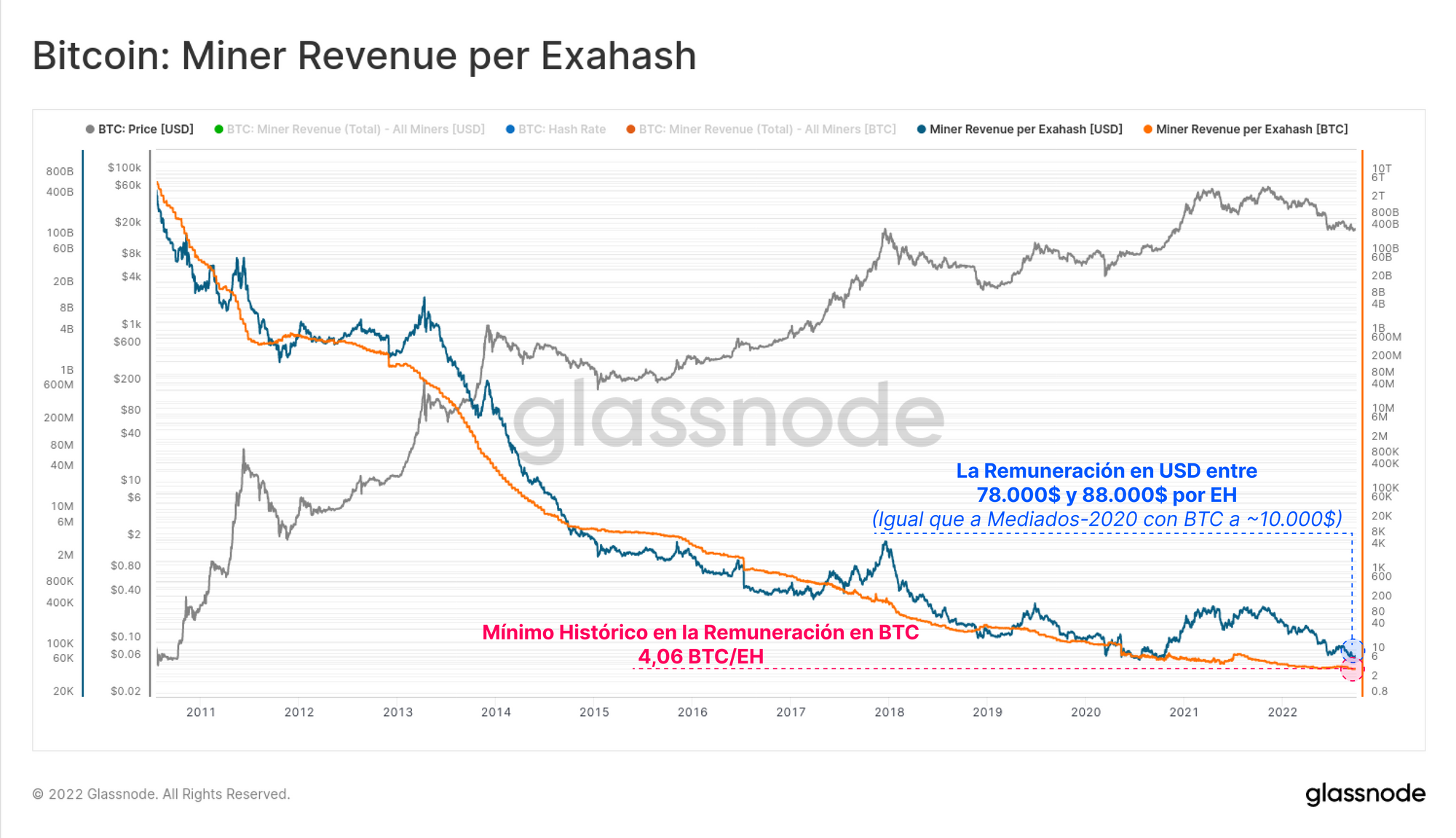Denominado en dólares americanos esto significa que se generan unos ingresos de entre 78.000$ y 88.000$ por EH al día. De modo que hemos regresado a valores que no veíamos desde octubre del 2020, algo después de que se produjese el halving del 2020, cuando el precio de BTC rondaba los 10.000$ (estando ahora en ~20.000$). Por esto, vemos que desde octubre del 2020 una crecida del 66% en la Dificultad y el Hashrate aproximadamente equivalen a un nuevo halving en lo que respecta a la remuneración por hash.