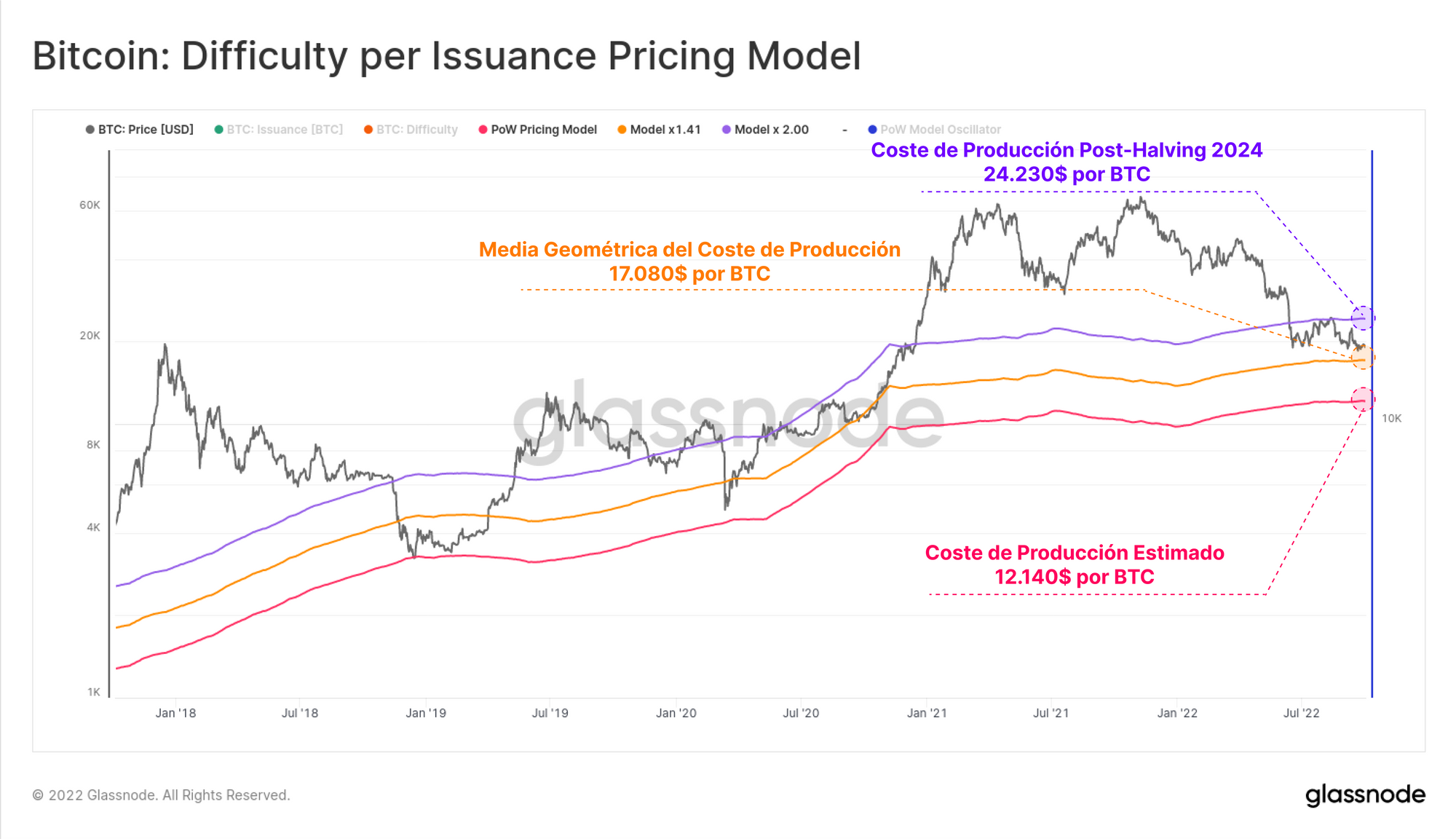 - 🟠 La media geométrica de los dos trazos anteriores en los 17.080$, lo que en cierta medida ilustra el nivel más probable en el que el precio del activo les cause a los mineros un elevadísimo estrés financiero.