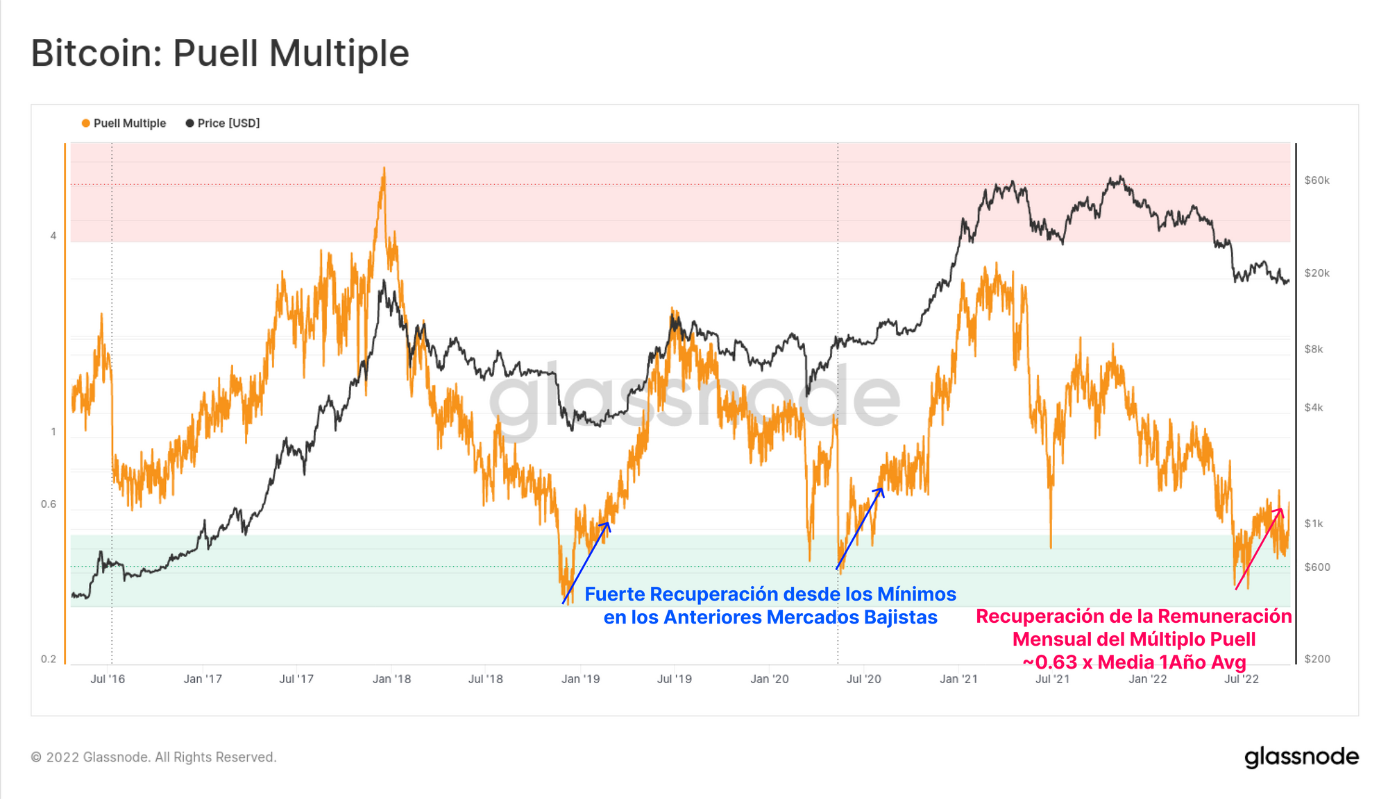 Todos los anteriores ciclos bajistas atravesaron un potente repunte desde los mínimos del Múltiplo Puell, algo directamente asociado con el desahogo que nos brindan las recuperaciones en el precio una vez que se asienta el mínimo absoluto del mercado en cuestión.