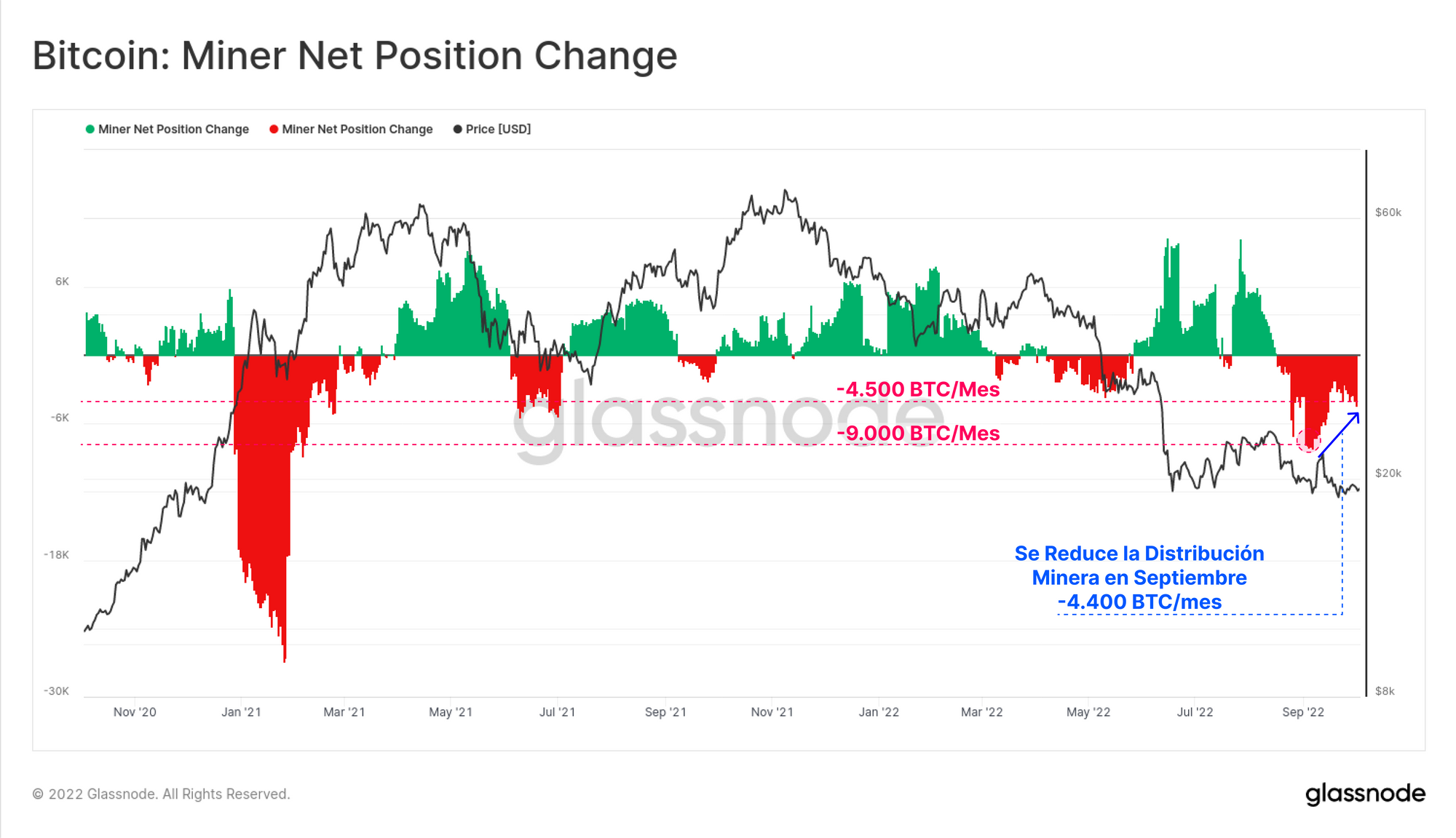 Para terminar nuestro análisis, nos adentramos en los actuales patrones de distribución monetaria de los mineros a fin de conocer qué impacto está teniendo todo esto sobre sus arcas. La siguiente gráfica es el cambio a 30 días de las carteras mineras, y aunque si bien es cierto que la distribución se ha ralentizado, sigue estando en torno a los 4.500 BTC al mes. Supone una reducción del 50% desde el pico que alcanzaron a comienzos de septiembre.