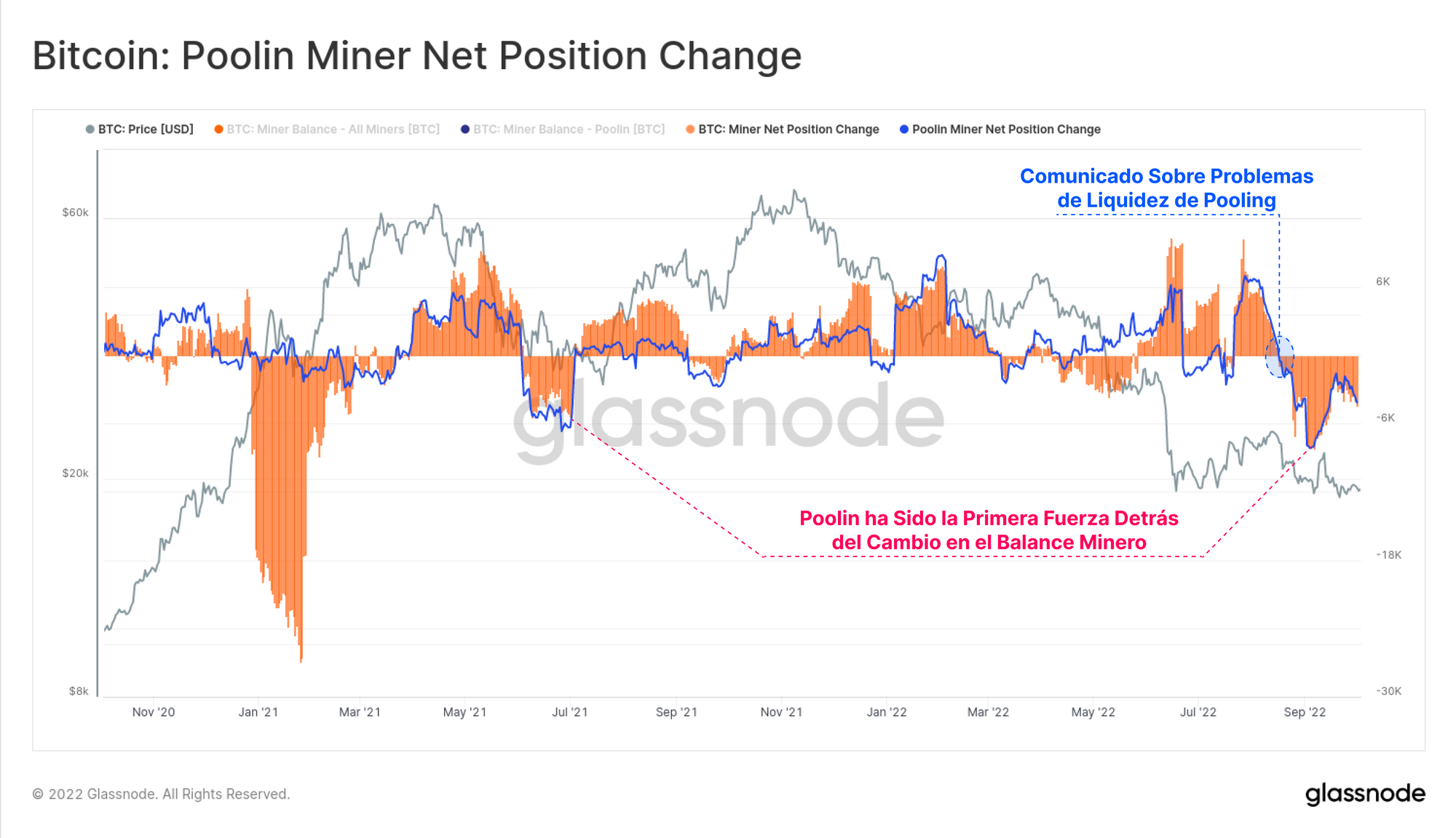 Sea como sea, si seguimos investigando, nos encontramos con que la gran mayoría del gasto actual proviene de los mineros asociados a Pooling. La curva naranja muestra el cambio a 30 días de todos los mineros, mientras que la curva azul es la asignada a Pooling específicamente, y demuestra que casi todo el gasto viene dado de la mano de este grupo en particular.
