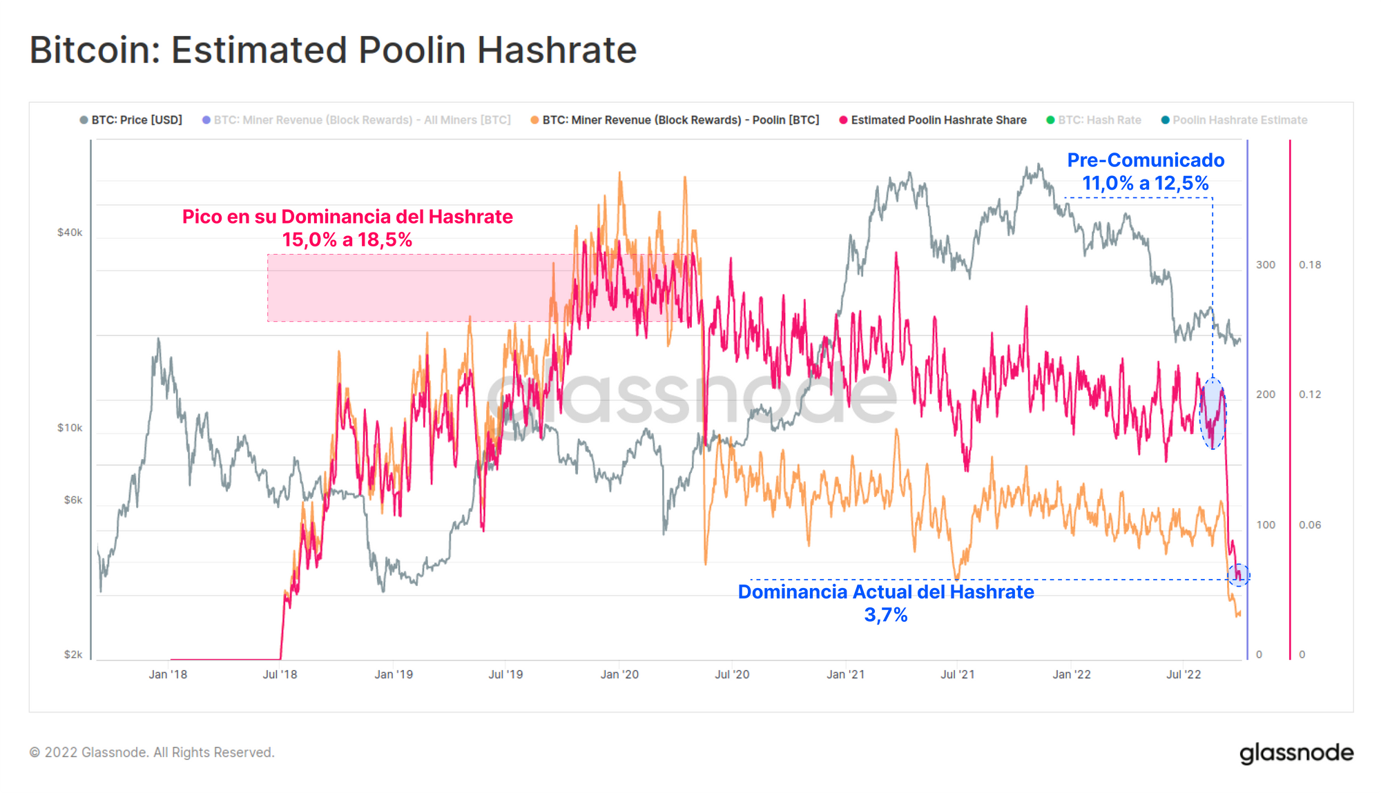 En el Pulso de Mercado que lanzábamos por aquel entonces, mostrábamos cómo usar las herramientas de Glassnode para estimar el hashrate de cualquier reserva minera en concreto. Es una metodología que utiliza su tajada de la recompensa por bloque comparada con el total a modo de guía, lo que nos permite visualizar cómo de rápido pueden los mineros redirigir su hashrate en momentos difíciles.