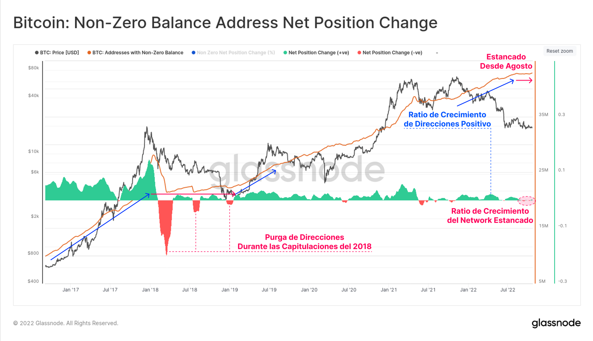El crecimiento de las direcciones con balance distinto a cero también se ha paralizado desde el mes de agosto, muy similar a lo que ocurrió en noviembre del 2018. Esto indica que a pesar de estarse creando unas 400.000 nuevas direcciones al día, la misma cantidad de direcciones están vaciando por completo sus balances.