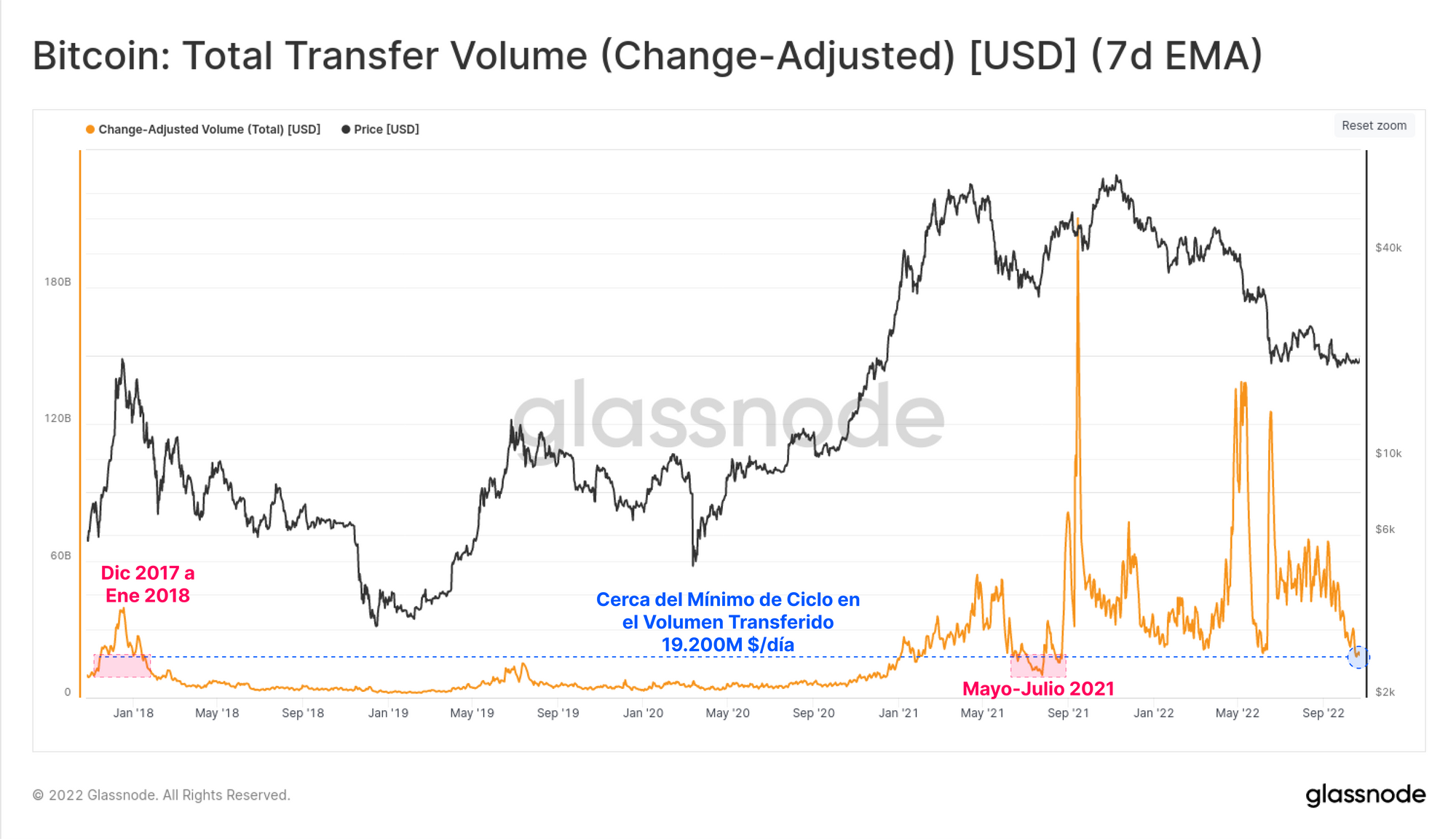 El volumen transferido (USD) también ha caído ya hasta los mínimos de este ciclo, rondando ahora los 19.200M $/día. Esto nos ubica por debajo del pico del volumen transferido que imprimimos en diciembre del 2017, y tan solo está algo por encima de los mínimos que dibujamos de mayo a julio del 2021.