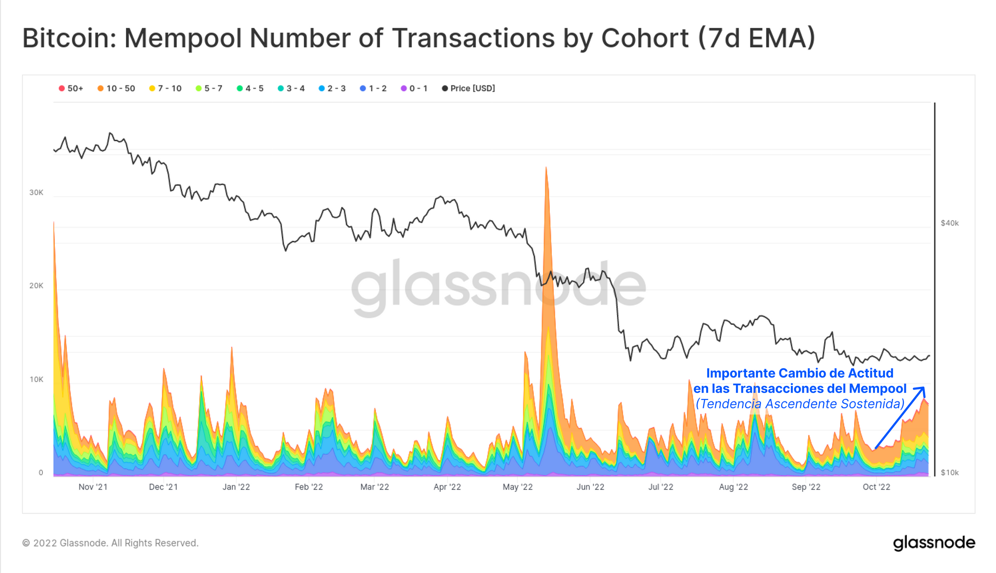 De todos modos, hay que mencionar el reciente cambio de actitud que se observa en el mempool. El volumen de monedas que se están movilizando mediante transacciones que atraviesan los nodos del mempool no para de crecer desde septiembre.