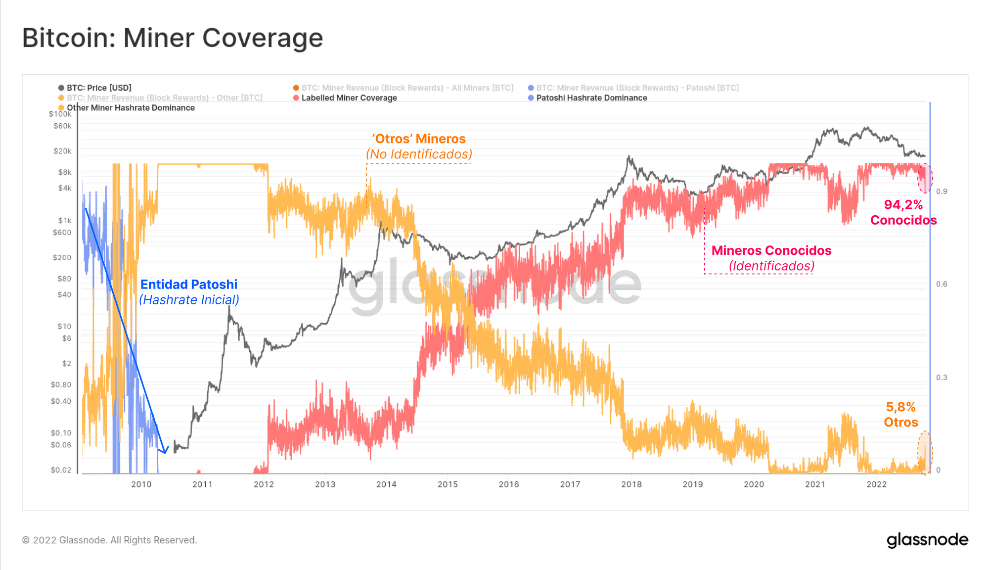 En la era posterior a marzo del 2020, los mineros que hemos identificado 🔴 ya suponen más del 95% de todo el poder de computación del network (especialmente después de la Gran Migración Minera de China de mayo del 2021). Los mineros desconocidos que hemos nombrado ‘Otros’ 🟡 representan el < 5% restante.