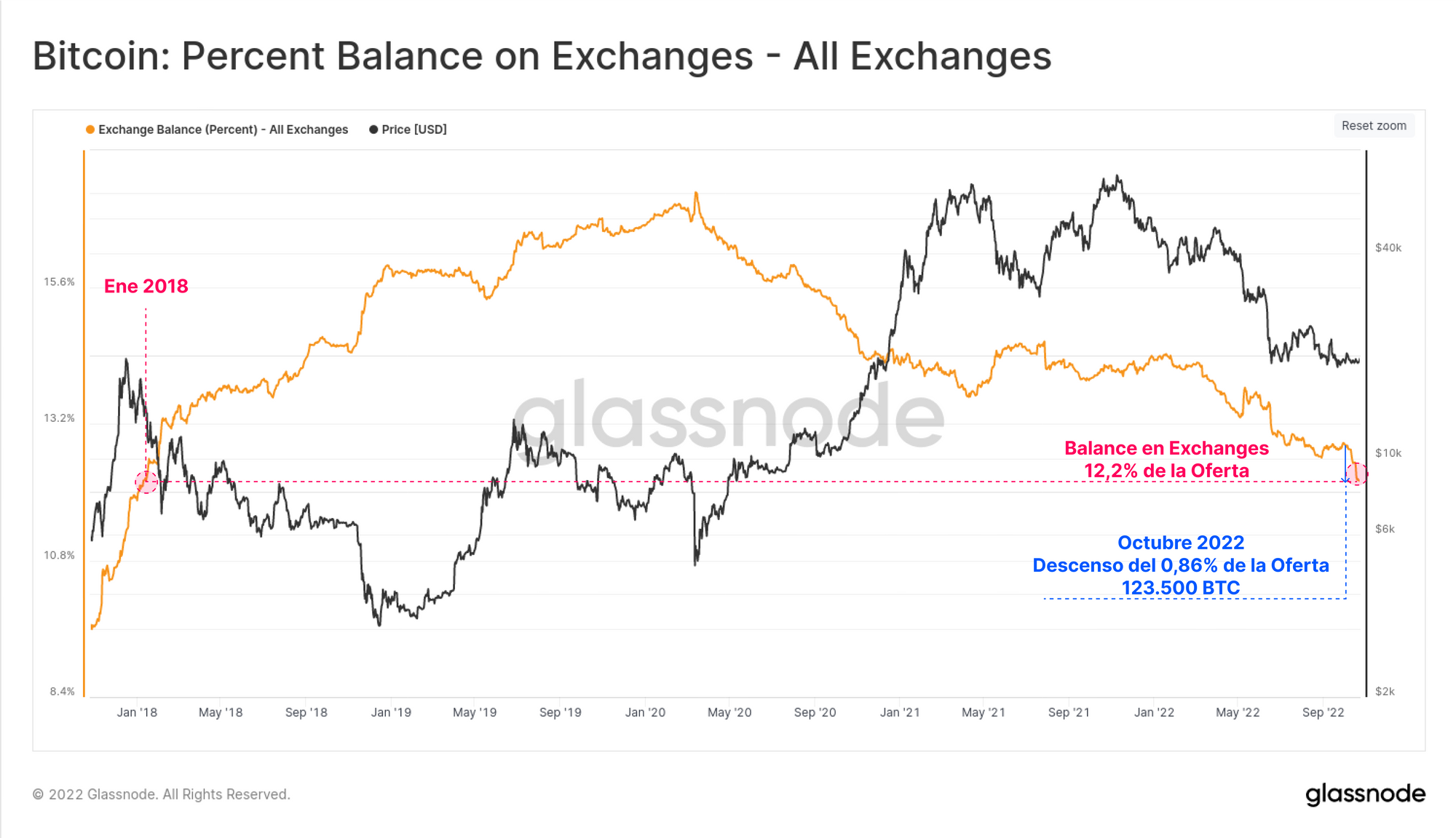 Sólo en octubre se retiraron 123.500 BTC, es decir el equivalente al 0,86% de toda la oferta en circulación. Si bien es cierto que el balance en las reservas de los exchanges no conforma una señal en sí misma, si tenemos en cuenta todo el contexto mencionado anteriormente, es un dato que dibuja un panorama bastante constructivo.