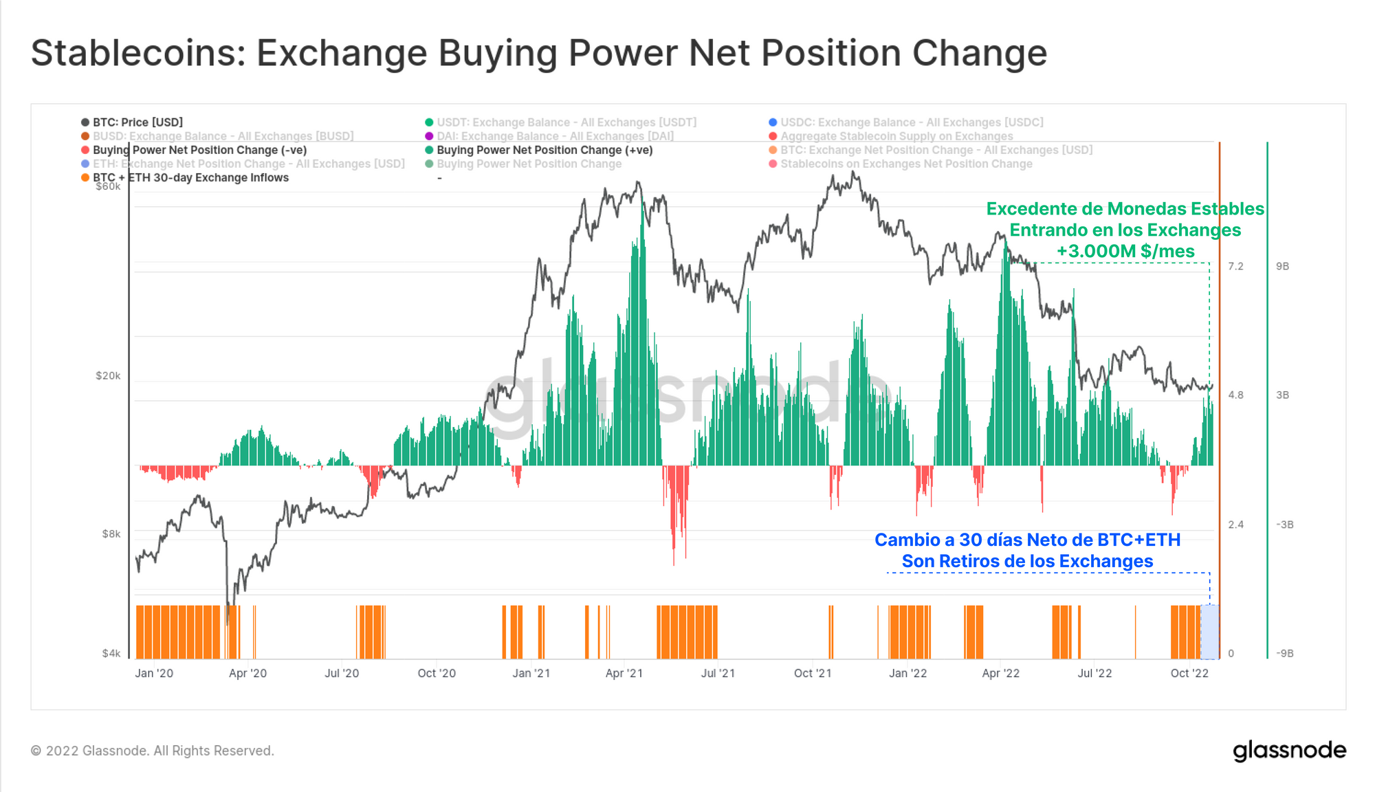 En estos momentos, vemos que en los últimos 30 días los flujos netos de BTC y ETH se componen de retiros, y simultáneamente, un excedente de 3.000M $/mes ha entrado a los exchanges en forma de monedas estables, aumentando por tanto el poder adquisitivo relativo.