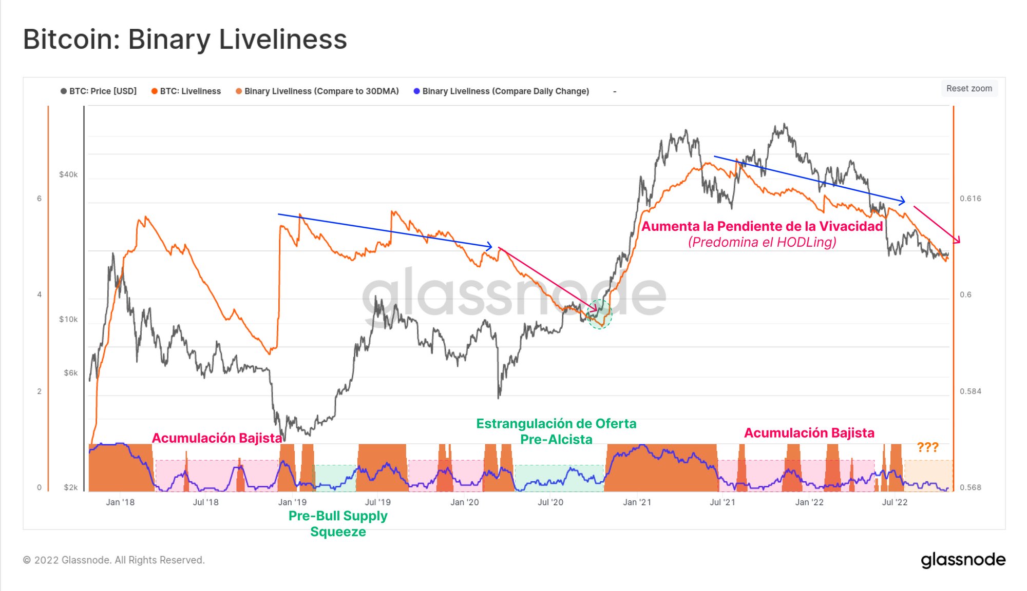 - El oscilador de la Vivacidad Binaria, que compara la reciente pendiente con la base media a 30 días, se asienta sobre mínimos históricos. Esta clase de eventos típicamente coinciden con un potentísimo comportamiento de HODLing a largo plazo, que normalmente encontramos entre mediados y finales de las fases de acumulación de un mercado bajista, e inmediatamente antes de un giro alcista (estrangulamiento de oferta).
