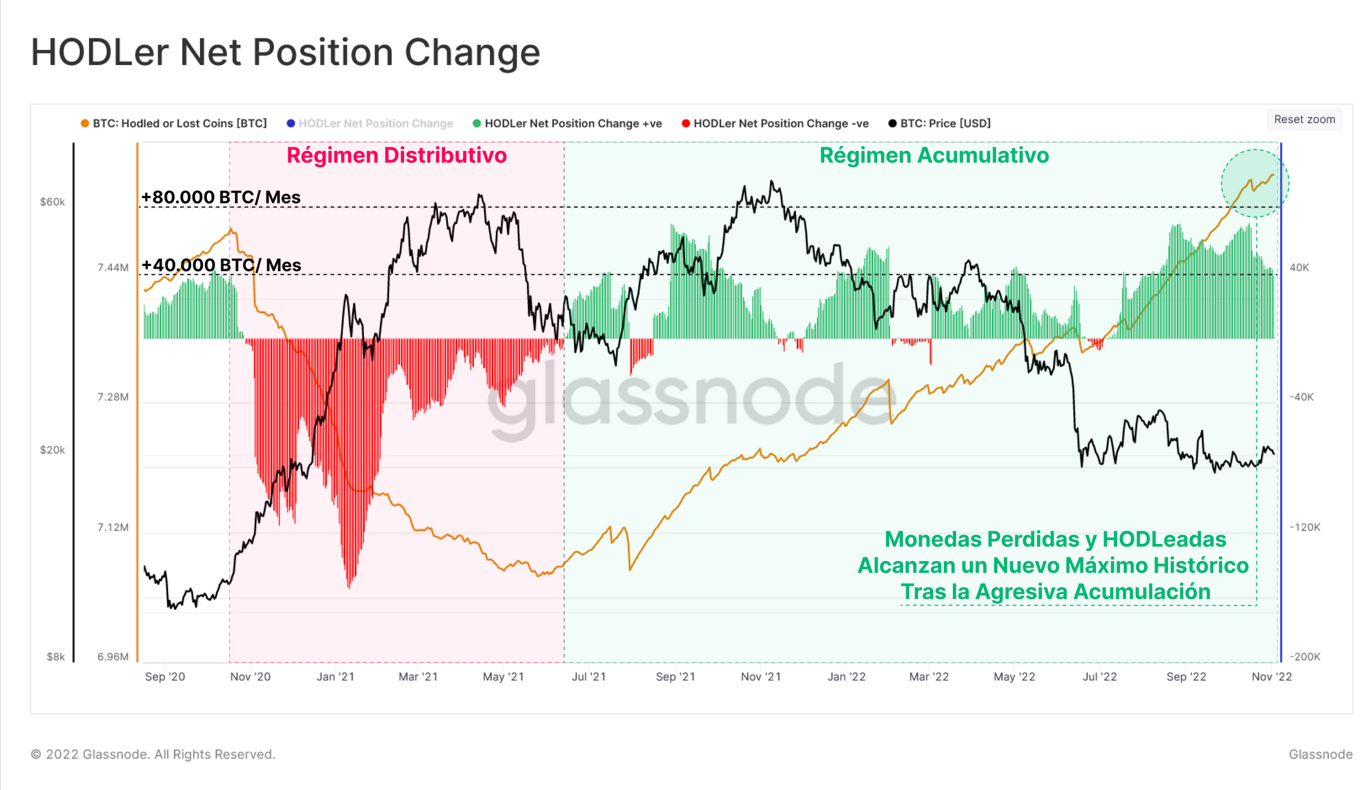 - 🟢 Tras el desplome en la acción de precio, la huella de gasto que dejaron los HODLers pasó a tener un carácter meramente acumulativo, atesorando monedas a un ritmo de +40.000 BTC / Mes. Este régimen de acumulación culminó con unos flujos agregados que amasaron +500.000 BTC en un periodo de 8 meses.
