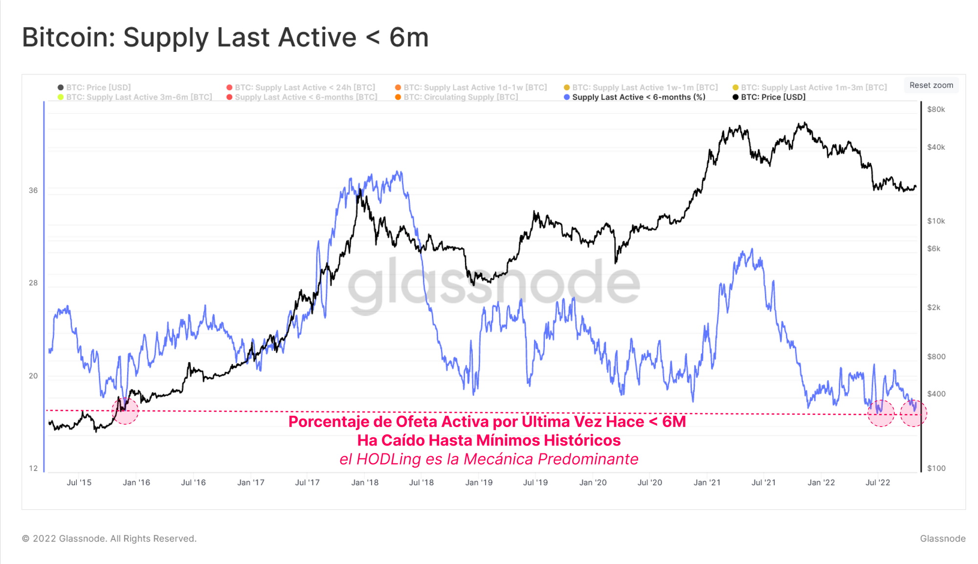 La oferta de menos de 6 meses de edad disponible en el mercado actual se ha mantenido en torno a mínimos históricos desde mayo del 2022, y continúa en descenso, evidenciando aún más el nivel tan extremo de HODLing que se lleva a cabo en el mercado actual.