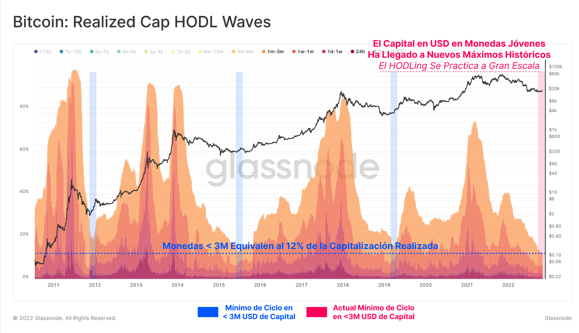 Tras el desplome impulsado por el colapso de LUNA-UST, la presencia de inversores de tamaño minorista ha estado equilibrada con la Capitalización Realizada, y nos sugiere que se ha producido una purga de inversores con mero afán especulativo, que por lo general tienen muy poca confianza en el activo. Sin duda, aún parece estarnos faltando el elemento temporal dentro del actual régimen cuando lo contrastamos con el precedente del 2019.