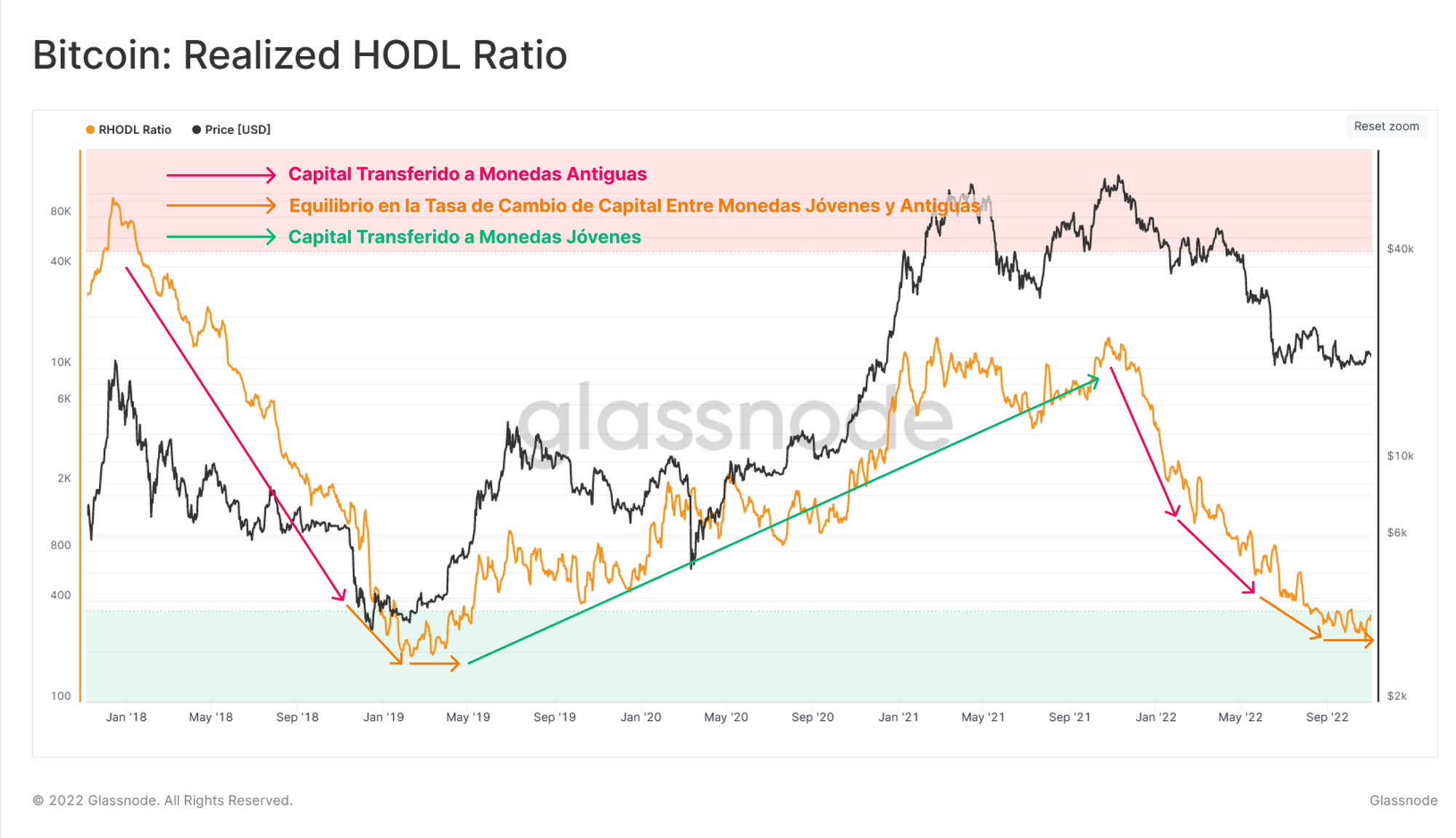 Por consiguiente, podemos utilizar el Ratio del HODLing Realizado como oscilador para comparar a gran escala el capital que atesoran las monedas jóvenes, con el que hay detrás de las más maduras. Se puede entender mediante el siguiente enfoque: