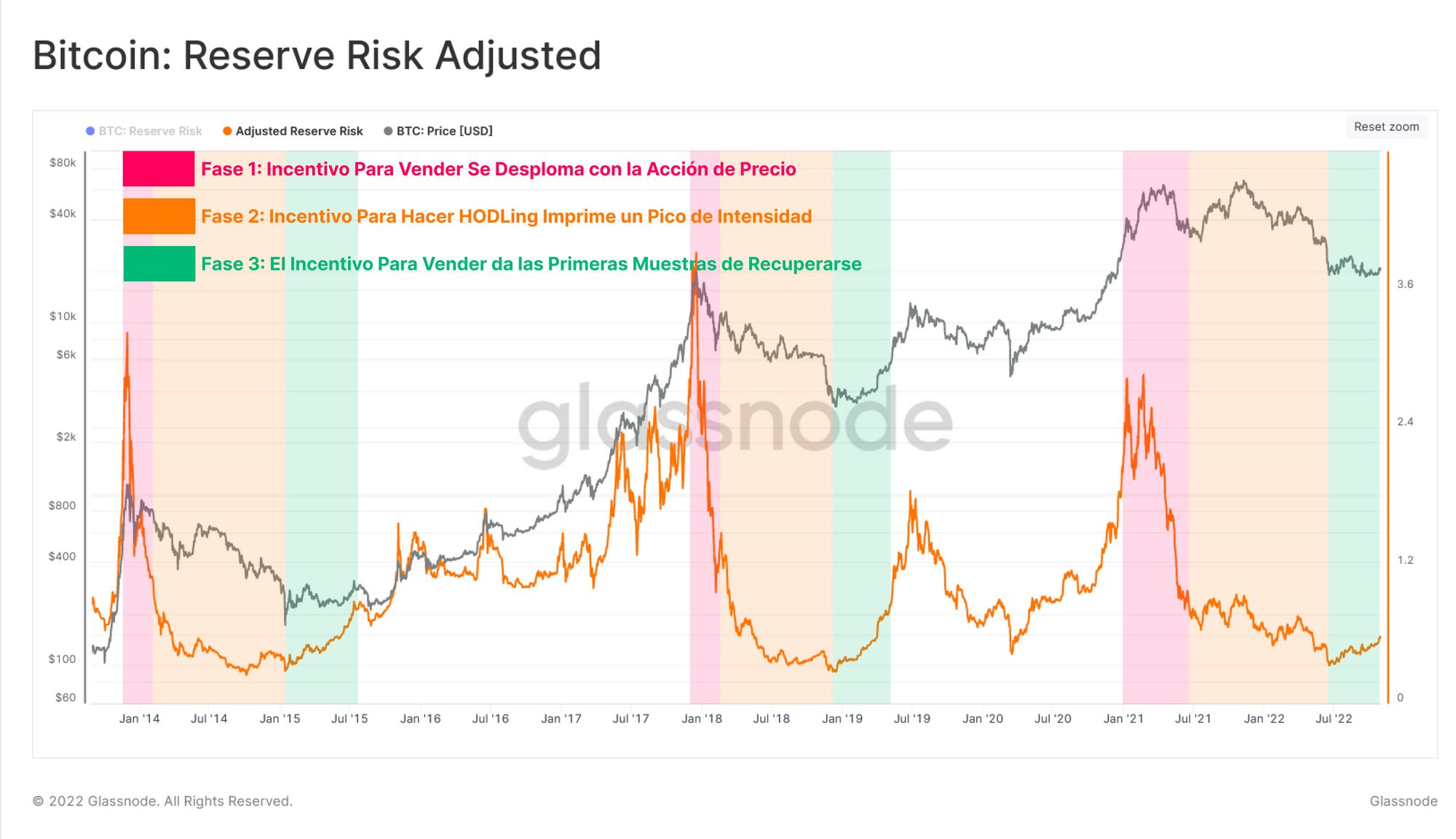 Podemos también aprovechar la métrica del Riesgo de Reserva Ajustado (una nueva métrica originalmente acuñada por el autor @hansthered), la cual es un oscilador cíclico que cuantifica el equilibrio entre el incentivo a vender del conjunto, y el gasto real acaecido por parte de las monedas que llevan latentes mucho tiempo.