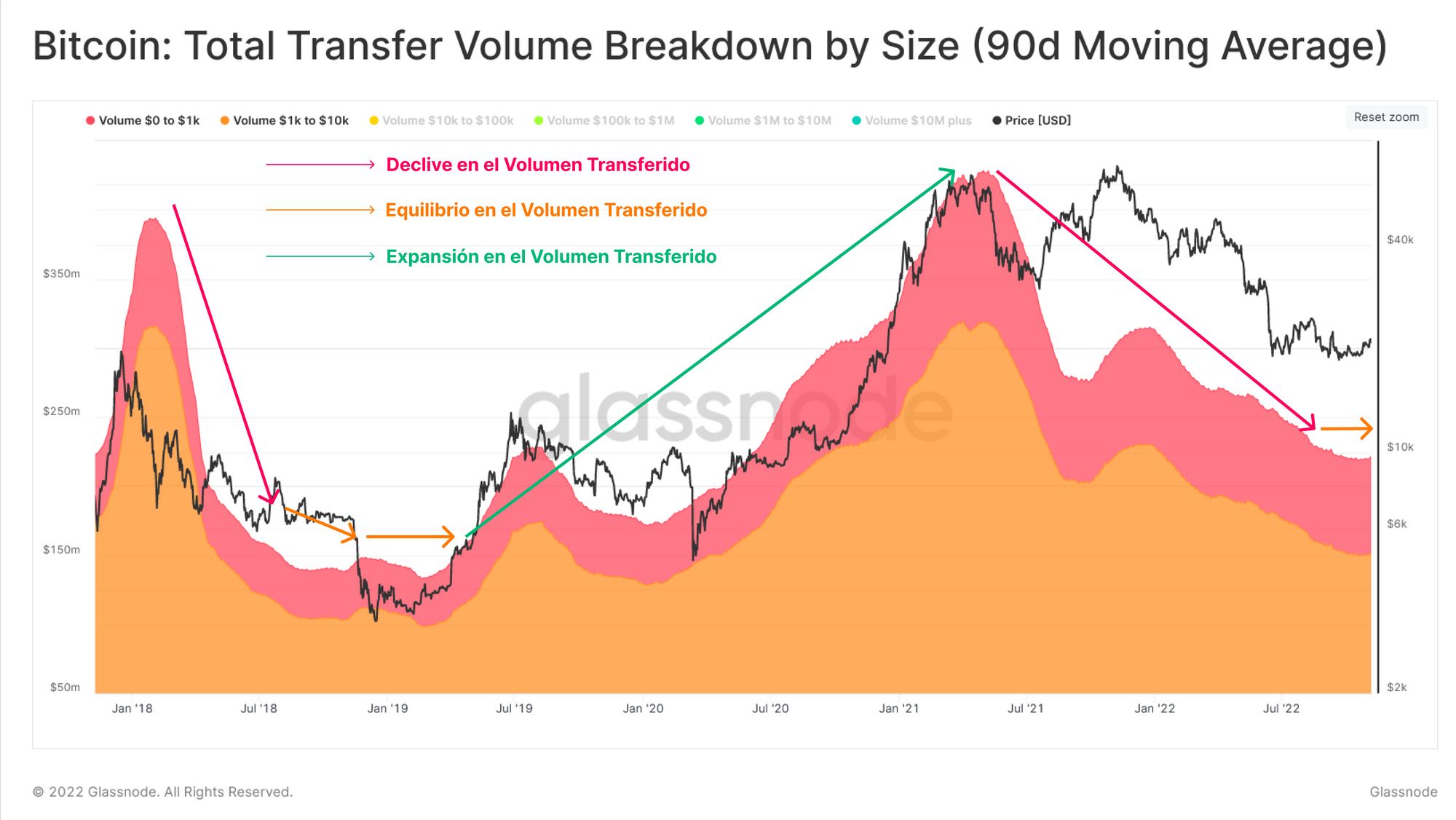 Como mencionamos anteriormente, la presencia de monedas jóvenes normalmente indica que hay inversores minoristas en activo, y esa presencia se desvaneció con el desplome de mayo del 2021. Es algo evidente también en el descenso de la cantidad de capital que se moviliza diariamente en forma de transacciones de menor tamaño.