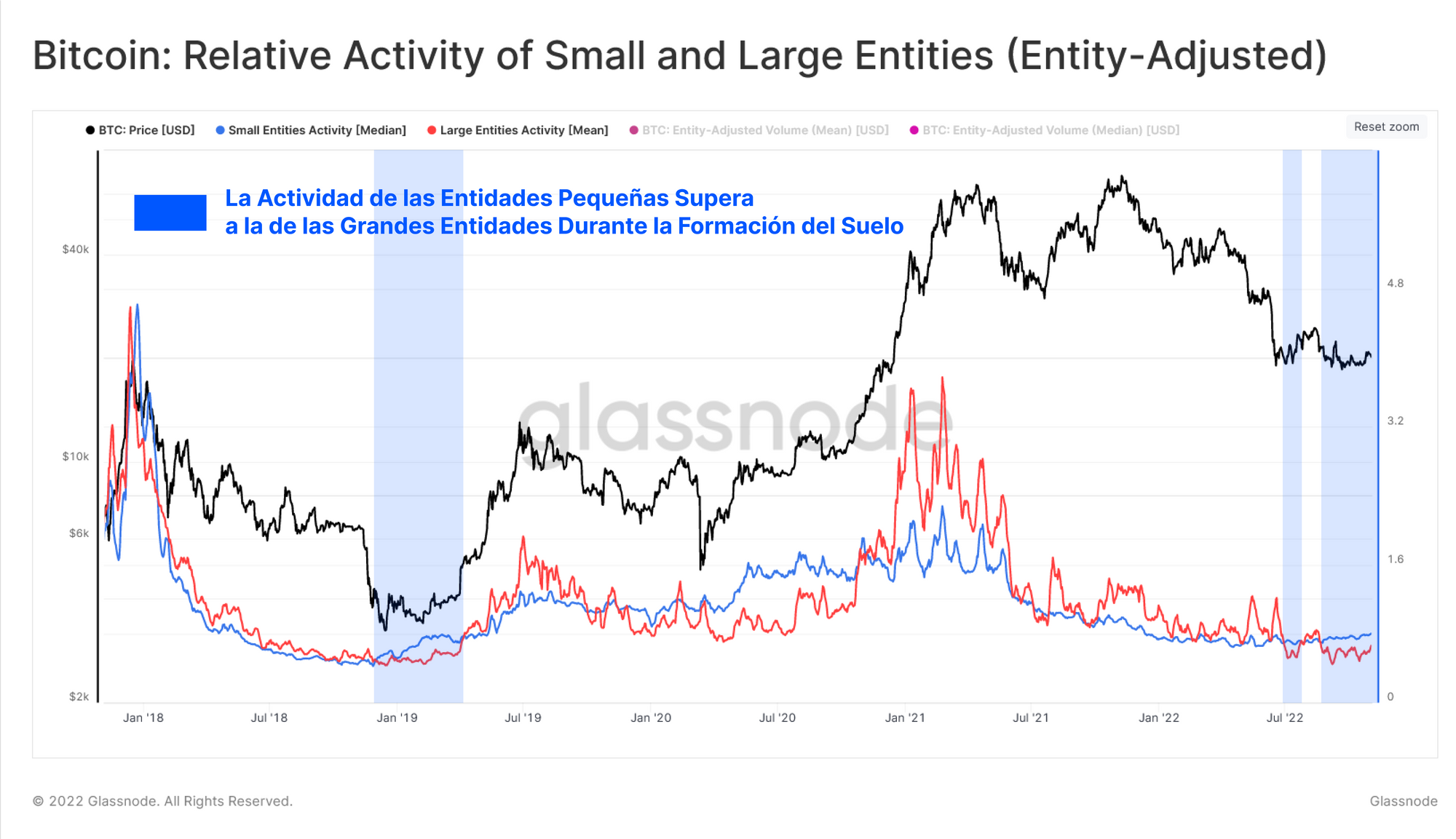 Una vez más, podemos resaltar el parecido con el suelo del 2018 en la estructura que se forma entre la actividad de las entidades pequeñas y grandes. Tras la capitulación final en la acción de precio, la actividad de las entidades más pequeñas aumentó y en la práctica impulsó los movimientos alcistas del 2019 y 2020, indicando la aparición de una cantidad más que decente de pequeñas transacciones, y por tanto dando la primera señal de que regresaba la demanda al mercado.
