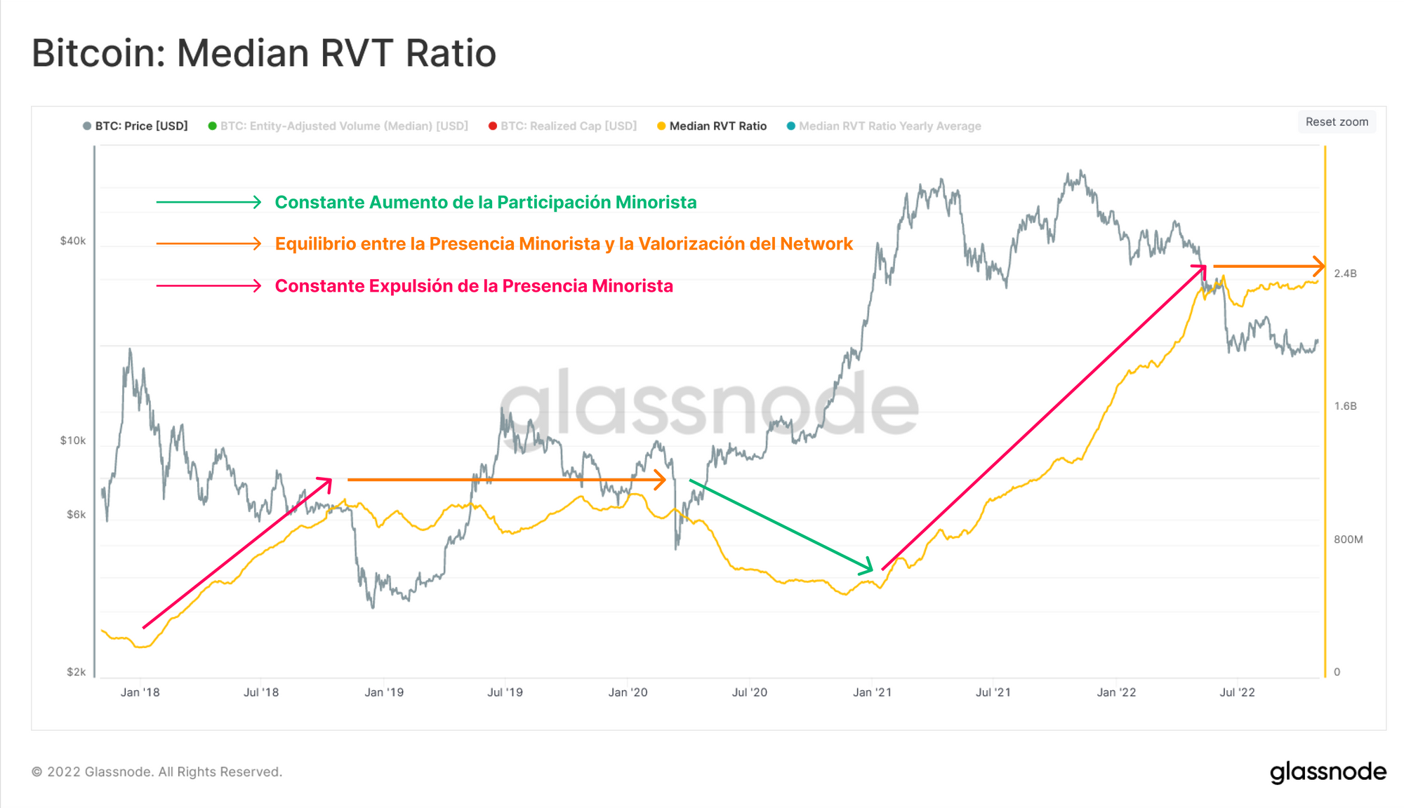- Una Mediana del Ratio que se mantiene estable es consecuencia de que tanto la participación minorista como la valorización del network son constantes, lo que refleja haber alcanzado un punto de equilibrio en la utilización del network. Esto mismo se asocia históricamente con periodos de transición a gran escala.