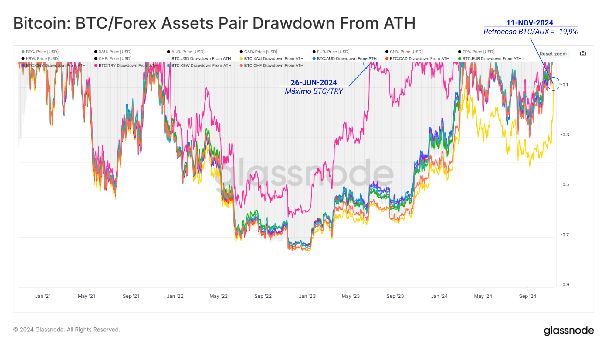 La siguiente gráfica nos muestra las recaídas desde el Máximo Histórico más reciente de Bitcoin (BTC) frente a varias monedas fiduciarias y al oro (XAU). Cabe destacar que el par BTC:TRY (lira turca) fue el primero en alcanzar un nuevo máximo histórico el 26 de junio de 2024, liderando la marcha antes de que otros pares se animasen a seguir su ejemplo. El 6 de noviembre de 2024, casi todos los pares BTC:Forex alcanzaron nuevos máximos, excepto BTC:Oro, que sigue aproximadamente un 19,9% por debajo de su máximo histórico, a pesar de la valorización actual de Bitcoin en torno a los 88.600$.