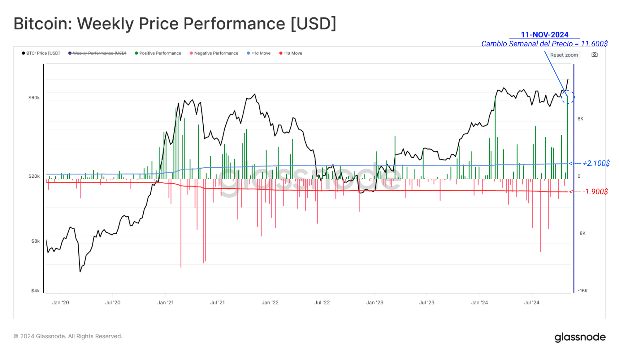 Siguiendo la estela de la última rotura hacia un nuevo máximo histórico, Bitcoin ha registrado su mayor vela semanal de toda la historia, con una impresionante ganancia de nada menos que 11,600$. Este repunte ha superado ampliamente a todos los movimientos semanales anteriores, alcanzando hasta casi cinco veces la banda estadística superior (1 desviación estándar), lo que indica una fortaleza alcista sin precedentes en el mercado.