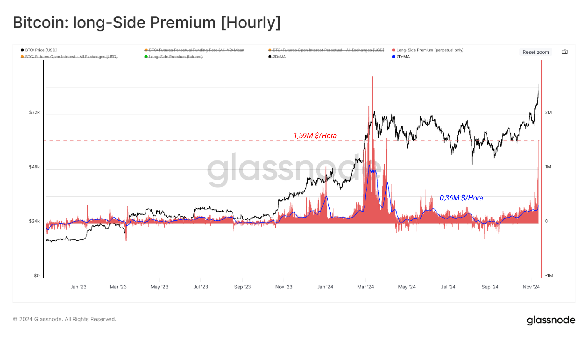 Generalmente, cuando vemos que la demanda aumenta en el mercado spot poco después solemos ver que sucede lo mismo en el mercado de los futuros perpetuos. El último pico que observamos en las primas de estos mercados perpetuos, que alcanzó los 1,59M $/hora el 12 de noviembre (con un promedio de 7 días de 392.000$/hora), refleja que realmente existe una gran demanda especulativa.