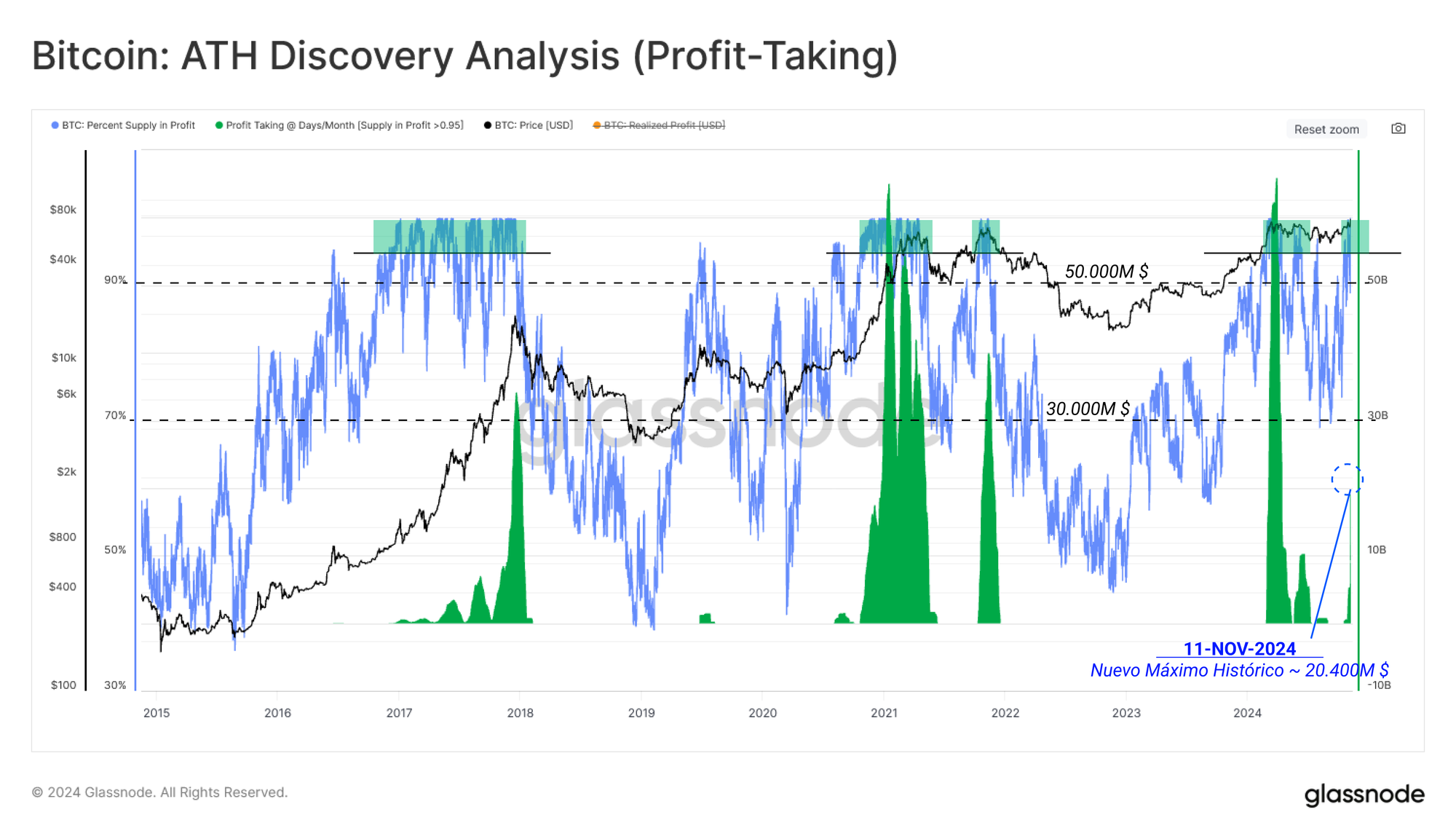 En este informe hemos analizado en detalle las características del reciente máximo histórico de Bitcoin, impulsado principalmente por una sólida demanda en el mercado spot, donde destaca el papel clave de los ETF spot estadounidenses. El interés institucional sin duda ha aumentado tras las elecciones, dejándonos grandes entradas de capital en los futuros de CME y ETF, con clara preferencia por el mercado spot y propiciando la entrada de Bitcoin en una fase de descubrimiento de nuevas cotas. Más del 95% de la oferta en circulación se encuentra ahora en ganancias, lo que típicamente viene seguido de una significativa recogida de beneficios.