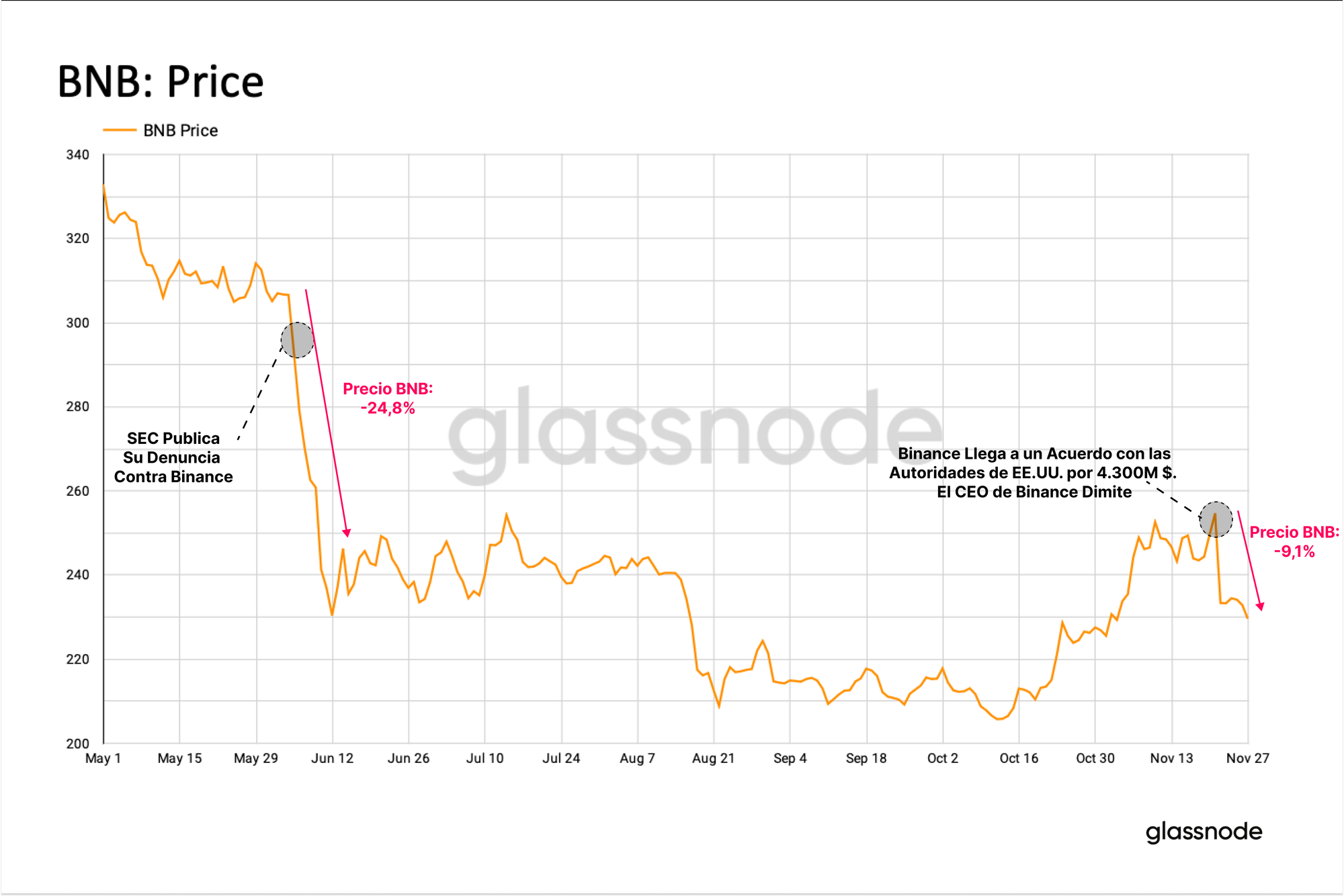 Tras conocerse la noticia, el precio de BNB sufrió una caída del -9,1%. Sin embargo, se trata de una reacción de mercado relativamente moderada en comparación con caídas anteriores, como la caída del -24% cuando el SEC publicó sus cargos contra Binance hace unos meses.