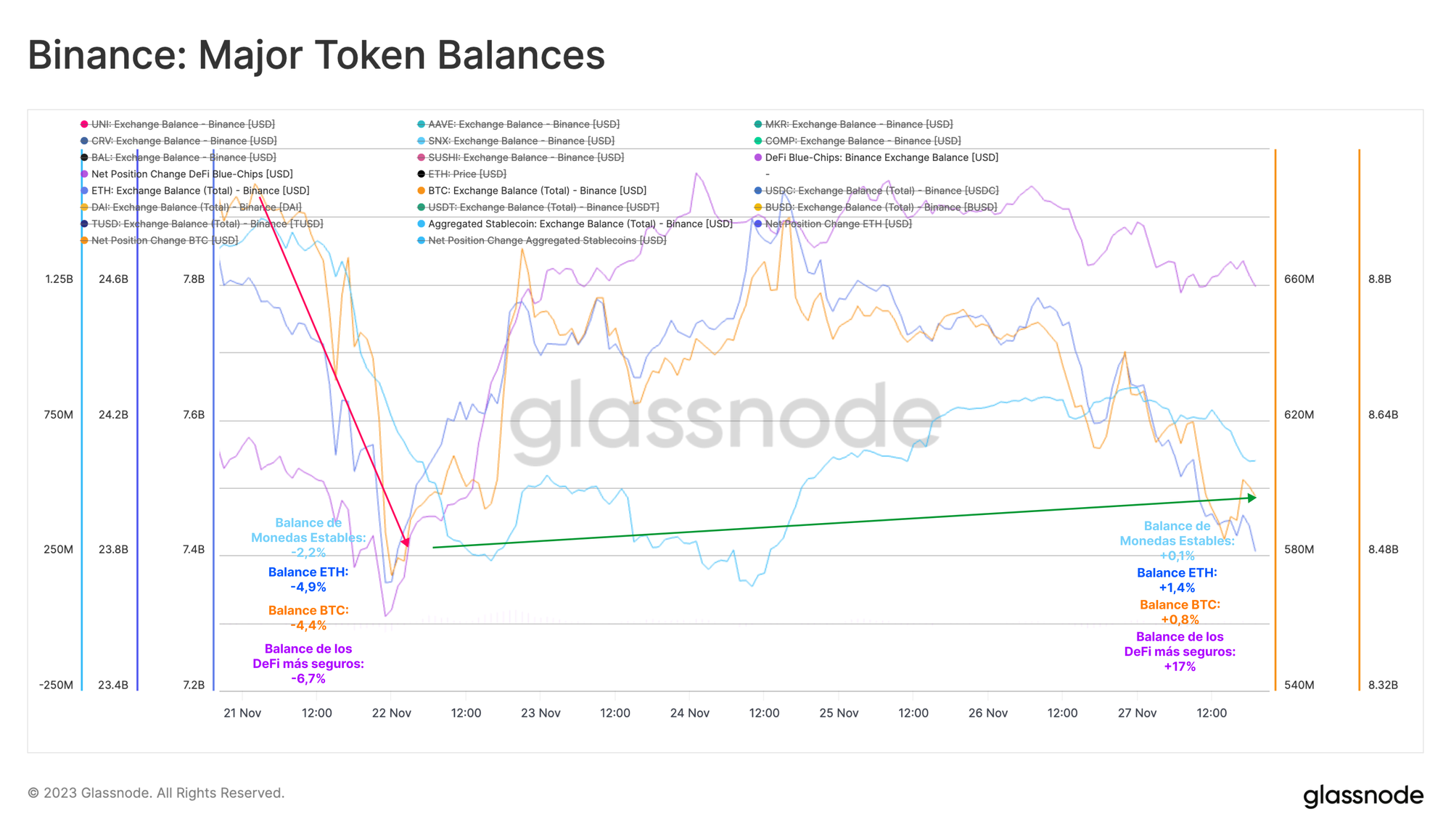 Tras la noticia, el exchange de Binance experimentó un importante aumento en los retiros de sus principales activos. El balance agregado de una serie de ‘activos seguros' DeFi disminuyó en un -6,7% en las primeras 24 horas, mientras que el balance de BTC, ETH y de Monedas Estables disminuyó en -4,4%, -4,9% y -2,2% respectivamente.