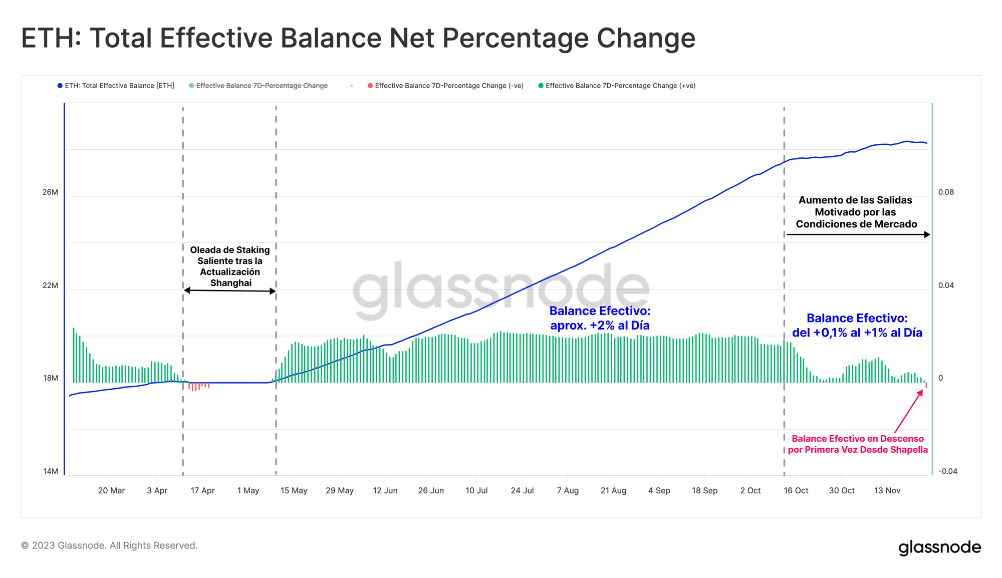 Consecuentemente, el Balance Efectivo Total, que representa el ETH en la Reserva de Staking que participa activamente en el Consenso de Prueba-de-Participación, ha ralentizado considerablemente su crecimiento y ahora está experimentando la primera disminución desde que se produjo la actualización Shanghai.