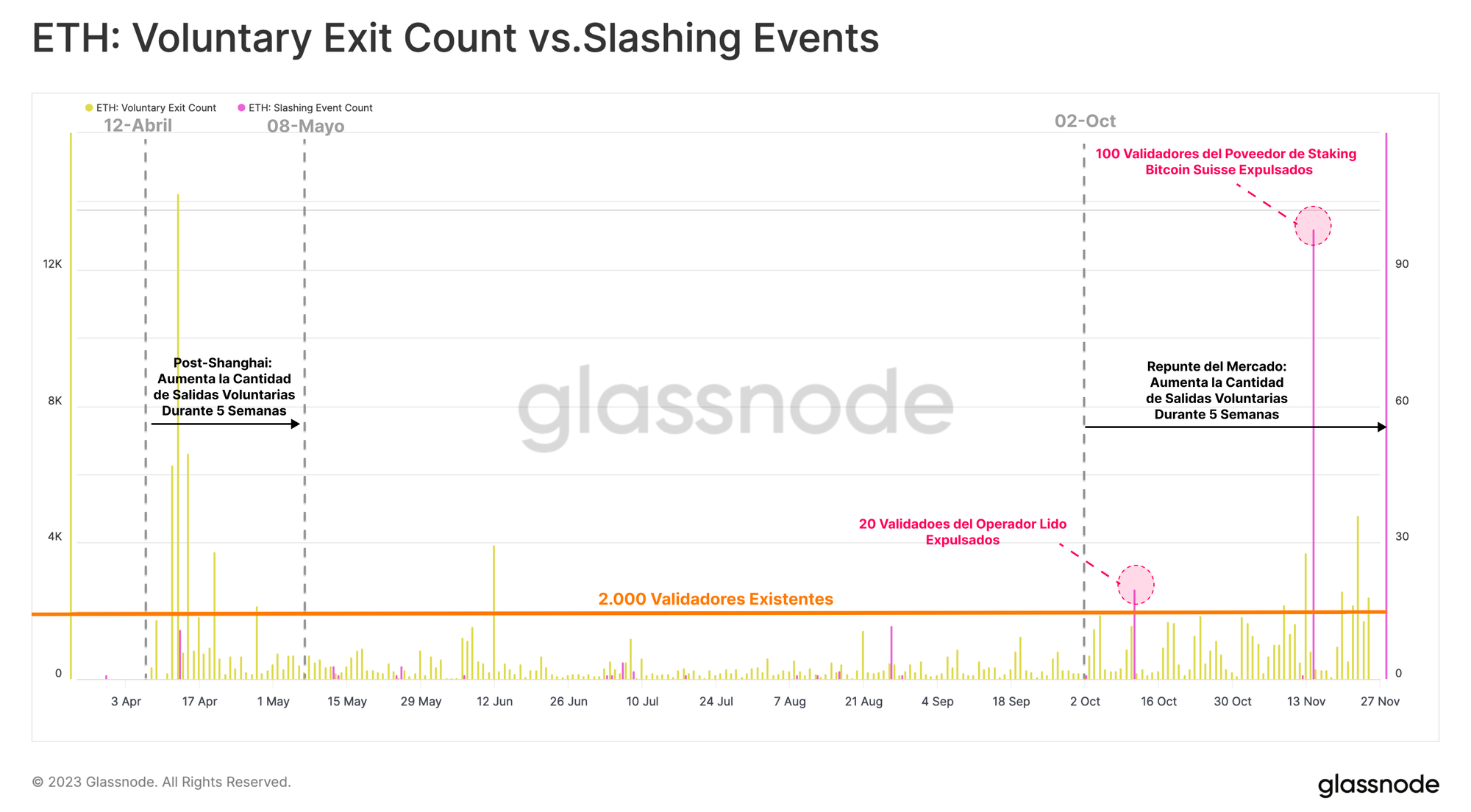 Al examinar de cerca a los validadores que abandonan, podemos ver que en gran parte todo responde a salidas voluntarias en las últimas ocho semanas. Las salidas voluntarias se refieren a los stakers que eligen salir de la reserva de staking de forma independiente. Es distinto de las expulsiones, que son sanciones aplicadas a los validadores que violan las reglas del protocolo.