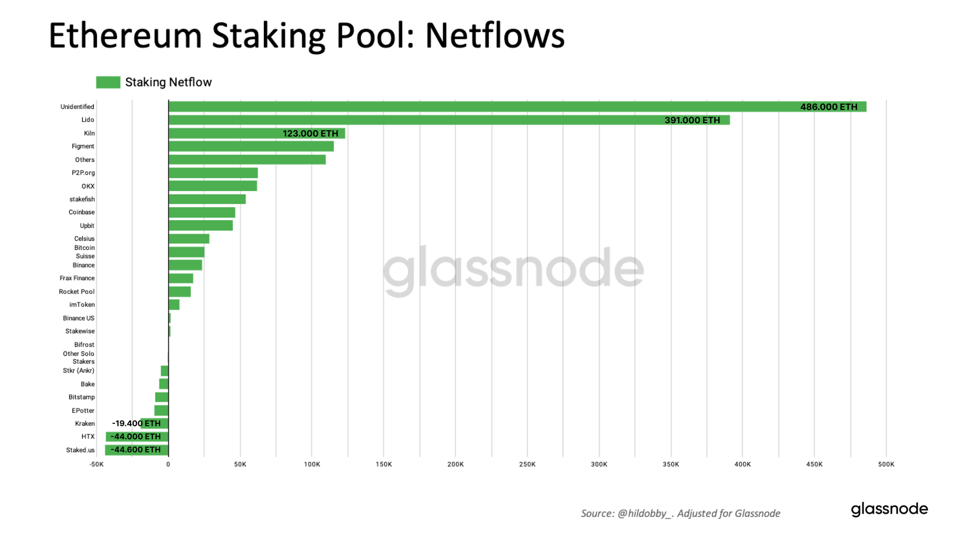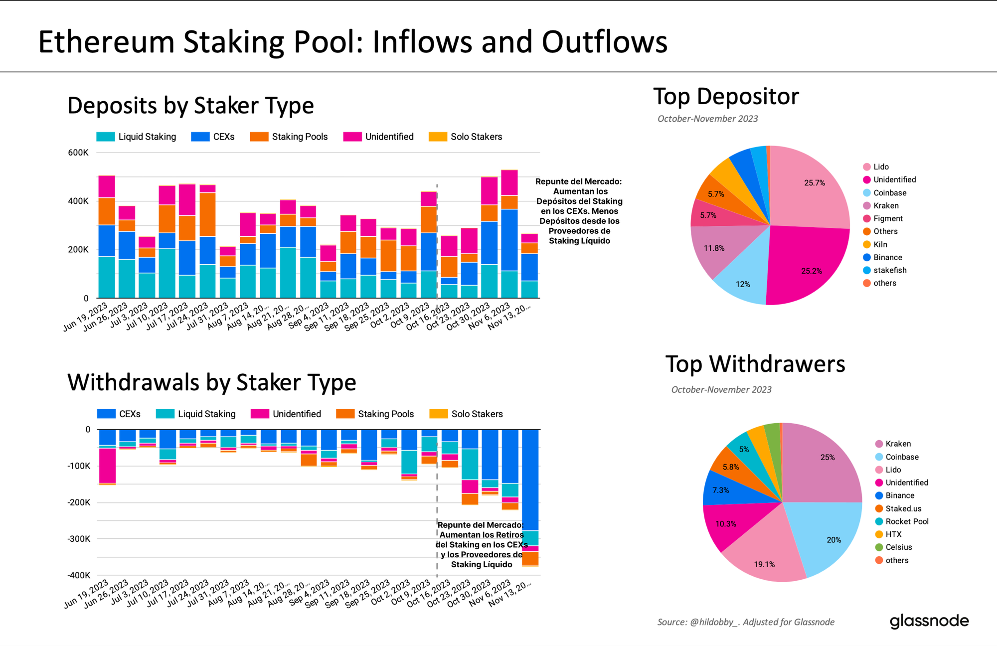 - Inversores optando por cambiar su configuración de staking, por ejemplo, transfiriendo su stake de los CEX a Proveedores de Staking Líquido (quizás debido a las preocupaciones regulatorias que hay en curso).