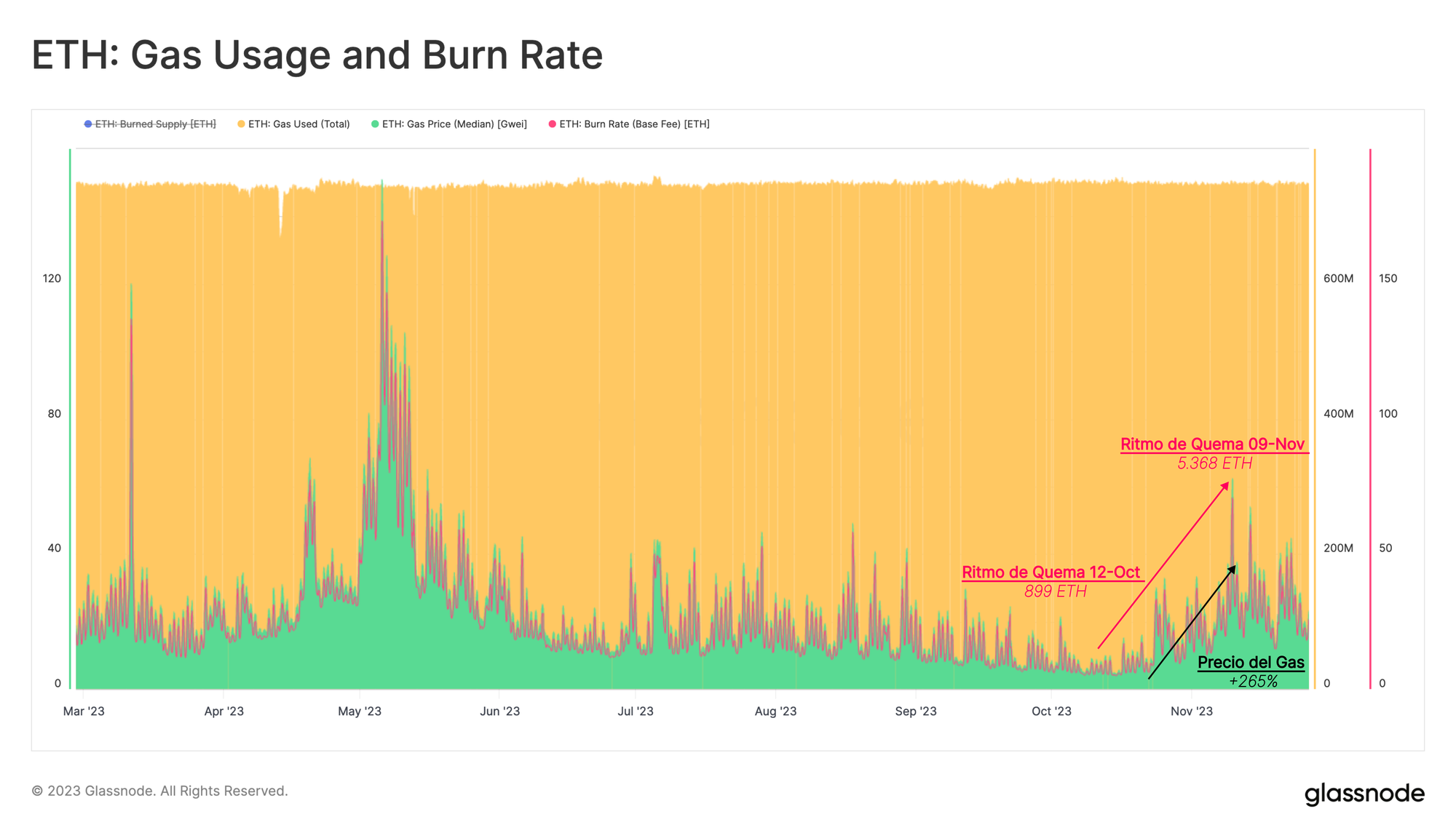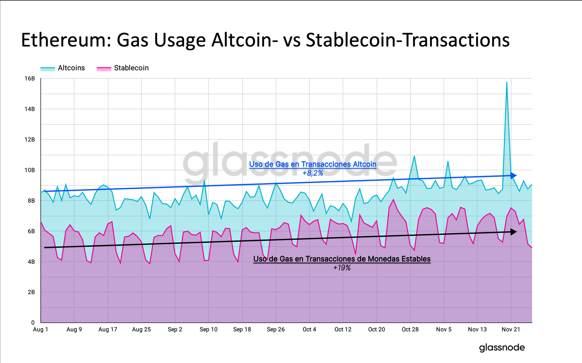 Además, el reciente aumento en la actividad de la red, impulsado particularmente por transferencias de tokens y monedas estables, nos ha traído una elevada demanda de transacciones. Esto, a su vez, ha ejercido bastante presión alcista sobre el precio del gas, generando con ello un aumento en las comisiones diarias de ETH que se queman a través del EIP1559.