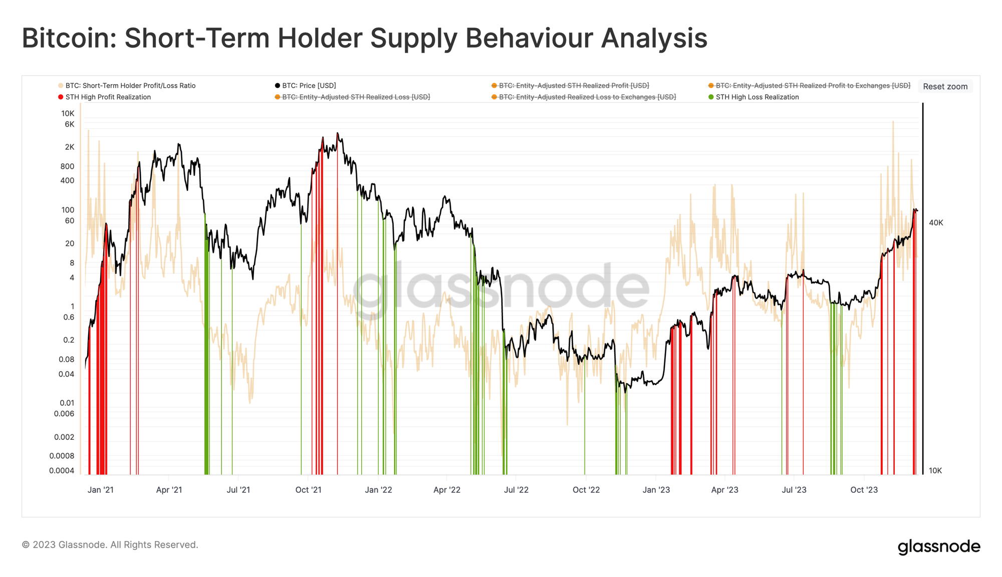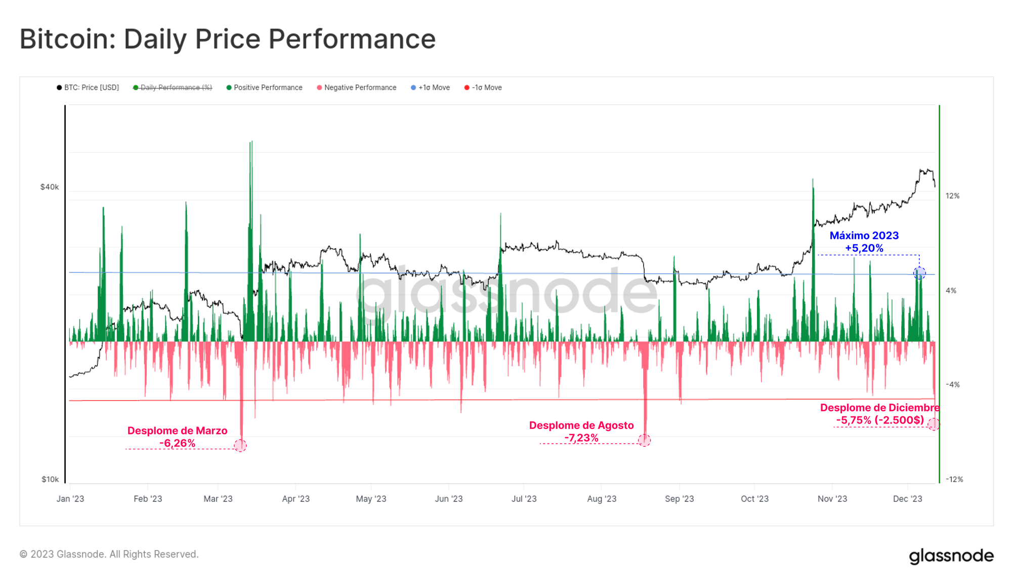 El mercado de Bitcoin ha realizado un viaje de ida y vuelta esta semana, abriendo en los 40.200$ y escalando a un nuevo máximo anual de 44.600$, antes de que el domingo por la tarde cayese bruscamente hasta los 40.200$. El movimiento alcista que nos propulsó hasta el nuevo máximo anual estuvo compuesto de dos impulsos de más del +5,0%/día (movimientos de +1 desviación estándar). La caída fue igualmente potente, cayendo más de 2.500$ (-5,75%), lo que la convierte en la tercera mayor caída en un solo día de todo el 2023.