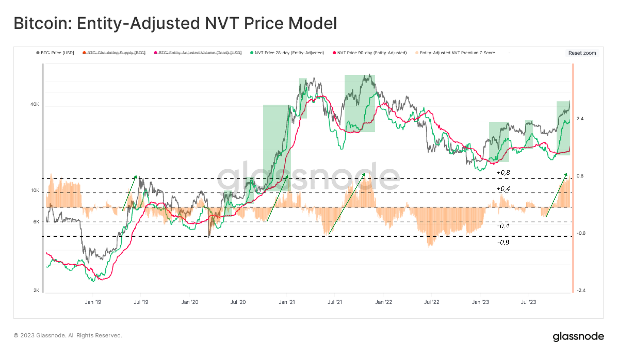 Este modelo pondera el precio realizado con el grado de escasez de la oferta (HODLing) vigente en toda la red. El HODLing a gran escala provoca que se contraiga la oferta, lo que aumenta la estimación del 'valor razonable', y viceversa. La siguiente gráfica destaca los períodos en los que el precio spot oscila por encima del clásico Precio Realizado 🔵 (un modelo de fondo), pero por debajo del máximo histórico del ciclo. A partir de esto, podemos sacar algunas observaciones:
