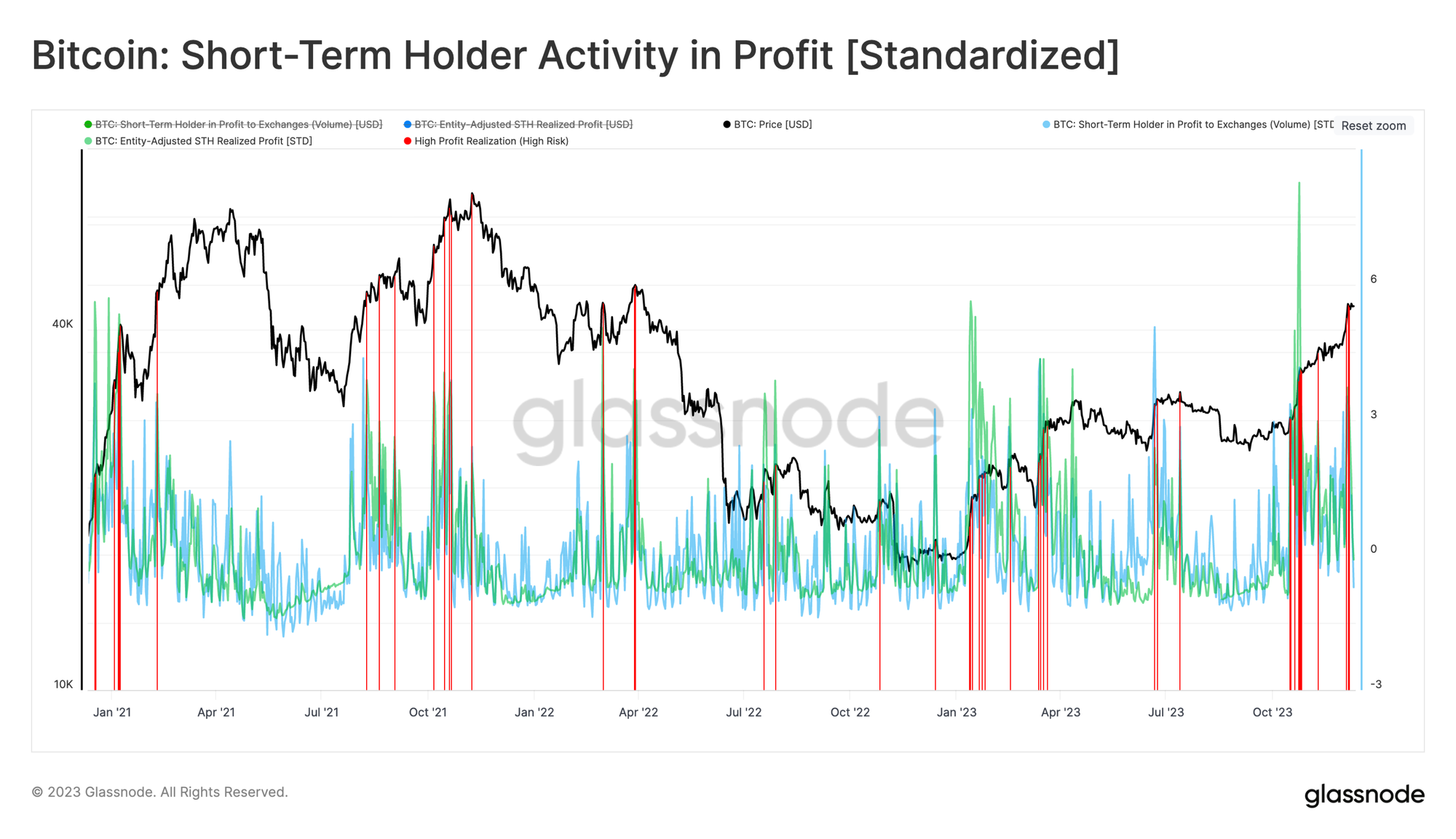Ahora, podemos profundizar en esta observación aún más buscando los días en los que las ganancias realizadas de los ICP aumentaron en más de una desviación estándar sobre el promedio de los últimos 90 días 🟥. Descubrimos que este indicador ha señalado eficazmente la ubicación de los picos locales a lo largo de los últimos tres años.