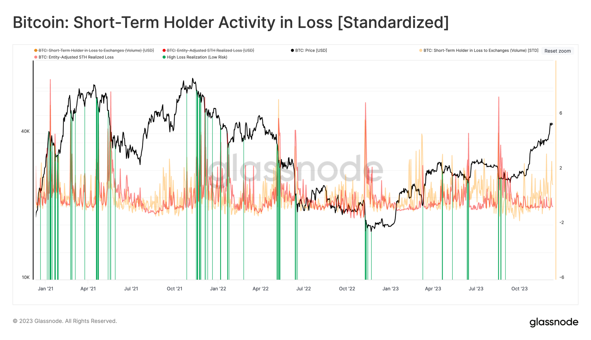 Siguiendo esta misma línea de trabajo, descubrimos que los períodos con alta materialización de pérdidas por parte de los ICP típicamente alcanzan una desviación estándar durante las mayores capitulaciones. Esto evidencia cuándo los inversores entran en pánico y envían monedas recientemente adquiridas de vuelta a los exchanges para finalmente deshacerse de ellas asumiendo una pérdida.