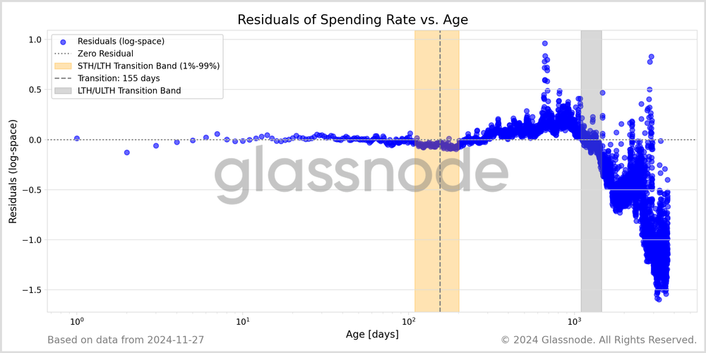 Es importante recalcar que el modelo se ajusta casi a la perfección para las monedas más jóvenes y sigue siendo válido, con pequeñas desviaciones, hasta aproximadamente cuatro años de antigüedad. Más allá de este punto, las desviaciones respecto al modelo se hacen más significativas, lo que sugiere que otros factores podrían estar influyendo en el comportamiento de gasto de los inversores a muy largo plazo (IULP).